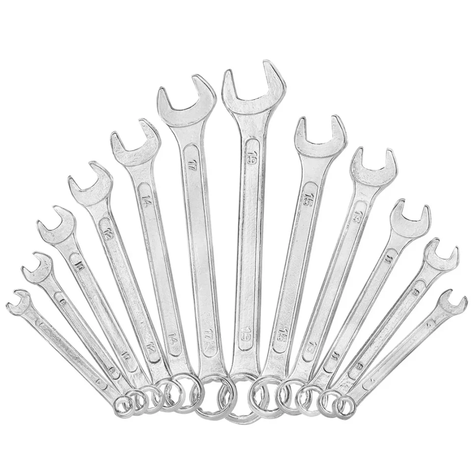 Ключи гаечные комбинированные ключи – универсальные гаечные ключи, совмещающие в себе функционал и преимущества рожковых и накидных ключей. Зевы комбинированных ключей имеют одинаковые размеры. Ключи гаечные с открытым и кольцевым зевами предназначены для монтажа либо демонтажа резьбовых соединений. Набор изготовлен из высококачественной стали Cr-V.