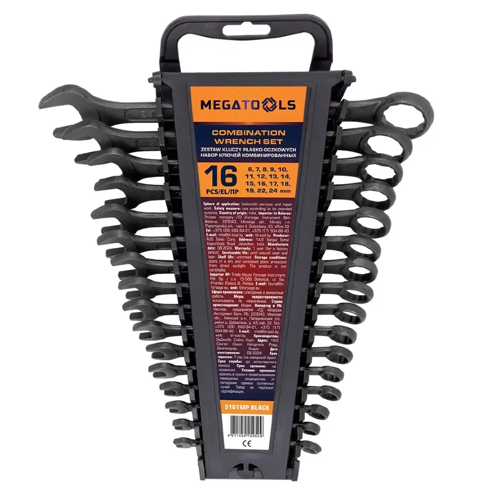 Ключи комбинированные, набор 16пр. (6-19, 22, 24мм) MEGATOOLS MT-5161MP BLACK