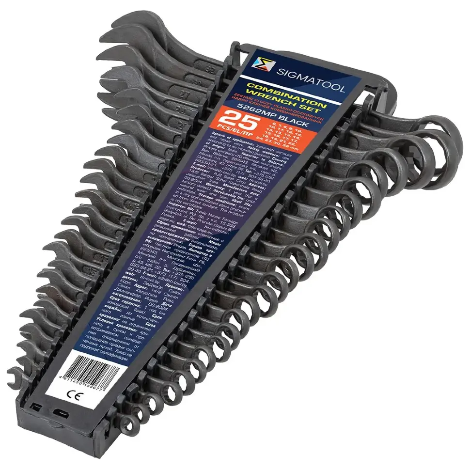 Набор комбинированных ключей SIGMATOOL Sigmatool‑5262MP BLACK включает 25 рожково‑накидных ключей метрической системы размеров 6, 7, 8, 9, 10, 11, 12, 13, 14, 15, 16, 17, 18, 19, 21, 22, 24, 27, 30 и 32 мм.