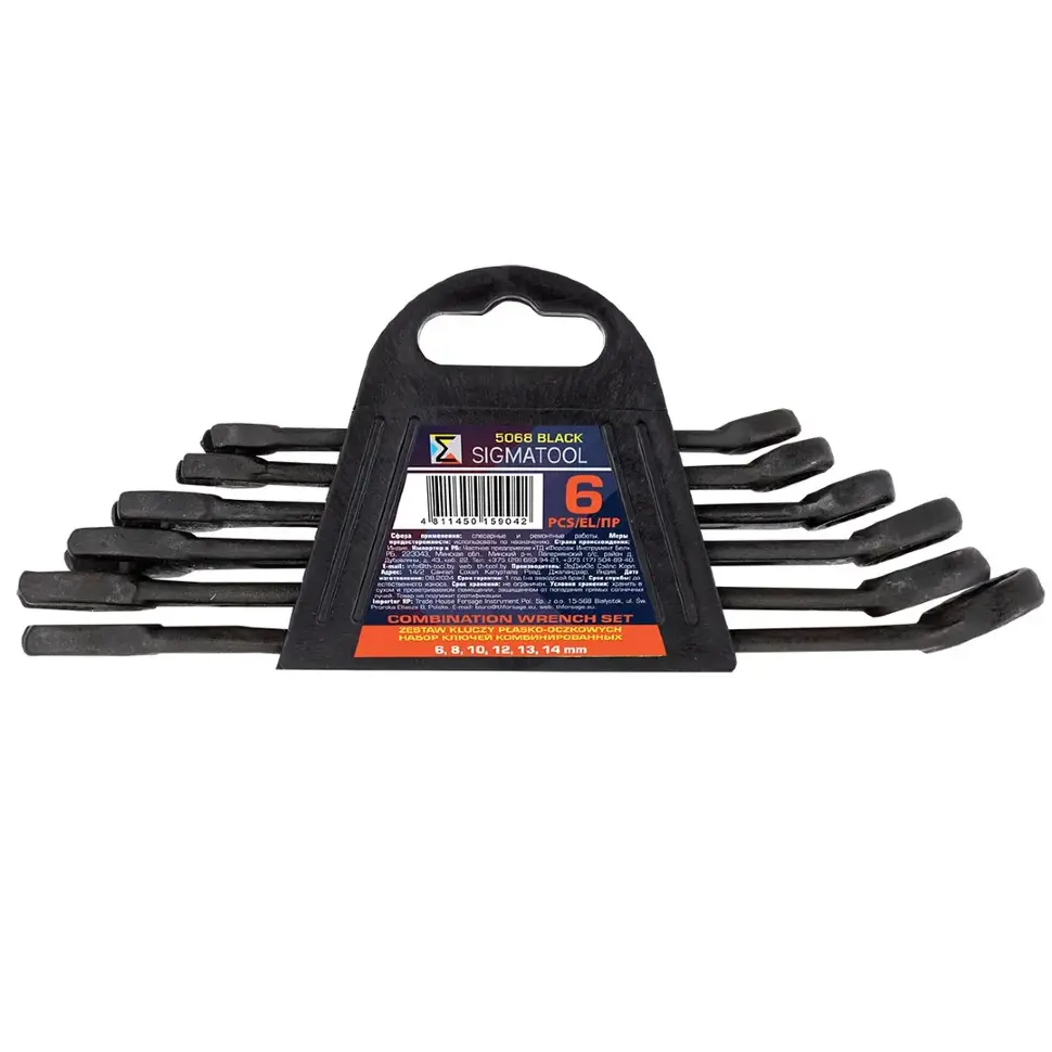 Набор комбинированных ключей SIGMATOOL Sigmatool‑5068 BLACK включает 6 рожково‑накидных ключей метрической системы размеров 6, 8, 10, 12, 13 и 14 мм. Каждый ключ имеет с одной стороны рожковый зев, а с другой — накидную 12‑гранную головку, что делает инструмент универсальным для работы с различными типами крепежа.