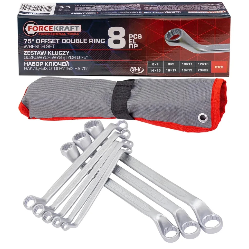Ключи накидные отогнутые на 75град., набор 8пр. (6х7, 8х9, 10х11, 12х13, 14х15, 16х17, 18х19, 20х22мм) FORCEKRAFT FK-5088P