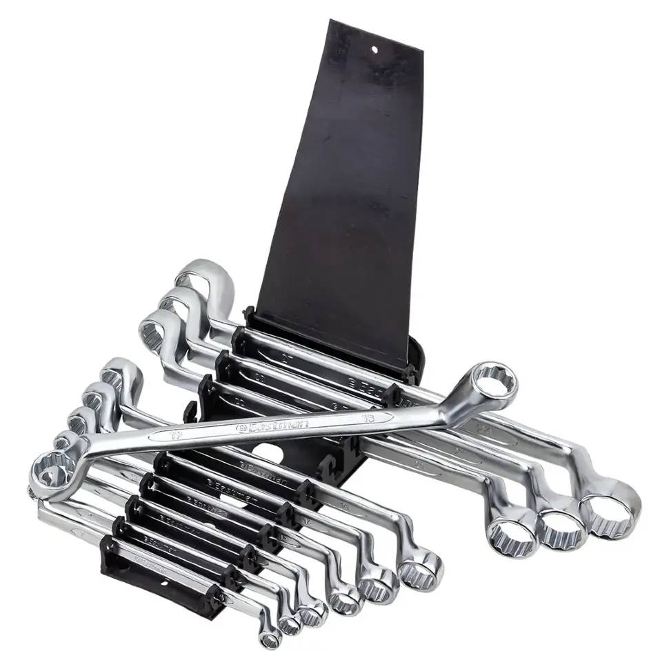 Ключи изготовлены из прочной инструментальной стали, что обеспечивает высокую износостойкость и долговечность. Отогнутая форма накидных головок облегчает доступ к крепежу в ограниченном пространстве и повышает удобство работы.