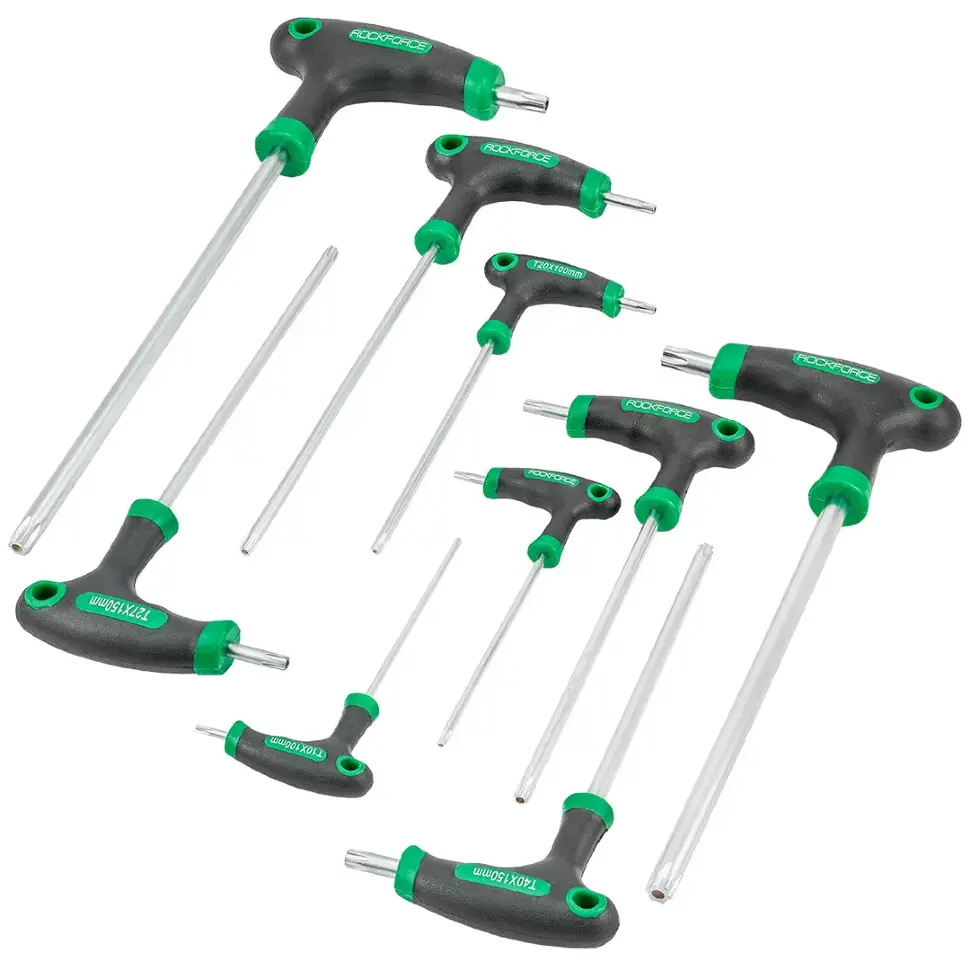 Ключи T-образные TORX, набор 9 пр. RockFORCE RF-2097 — высококачественный комплект инструментов, предназначенный для надежного затягивания и ослабления крепежей с TORX-головками. T-образная конструкция обеспечивает равномерное распределение усилий, минимизируя риск проскальзывания и повреждения крепежа.