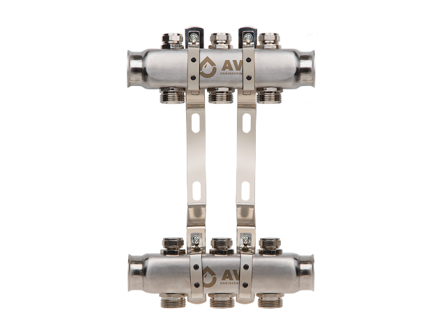 Коллекторная группа AVE162 AV Engineering Предназначена для распределения и регулировки систем теплого пола. Материал изготовления коллектора - нержавеющая сталь. Подключение 1" Межосевое растояние: 210 мм Расстояние между выходами: 50 мм В комплект поставки входит: - 2 коллектора (подача и обратка); - крепление коллектора; - регулировочные вентили; - сливные краны; - резьба 3/4" Гарантия на коллекторы из нержавеющей стали - 5 лет Гарантия на комплектующие - 1 год --- Совместимые товары: AVE155023 Коллектор; AVE155004 Вентиль; AVE155005 Ручка пластиковая; AVE155007 Ниппель; AVE155003 Расходомер; AVE155006 Переход; AVE155012 Комплект; AVE155011 Развоздушник; AVE36311112 Комплект для подключения; AVE155009 Развоздушник автоматический; AVE3620212 Развоздушник автоматический; AVE155010 Развоздушник автоматический; AVE3620112 Развоздушник автоматический; AVE362101 Развоздушник автоматический; AVE155015 Заглушка; AVE155008 Заглушка; AVE155002 Евроконус (адаптер) 20(2.0); AVE155001 Евроконус (адаптер) 16 (2.0); AVE118T002 Насос циркуляционный AVE; AVE118T004 Насос циркуляционный AVE; 4033776 Насос циркуляционный WILO; 4033782 Насос циркуляционный WILO;