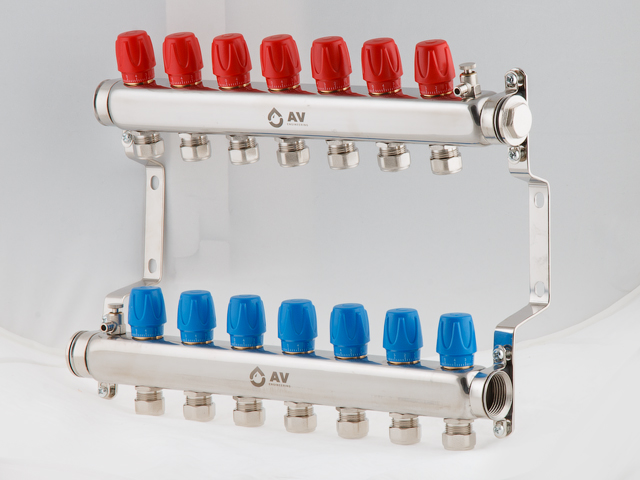 Коллекторная группа AVE135 AV Engineering Предназначена для распределения и регулировки систем теплого пола. Материал изготовления коллектора - нержавеющая сталь. Подключение 1" Межосевое растояние: 210 мм Расстояние между выходами: 50 мм В комплект поставки входит: - 2 коллектора (подача и обратка); - крепление коллектора; - ручные развоздушиватели; - регулировочные вентили; - евроконус 16х2.0 Гарантия на коллекторы из нержавеющей стали - 5 лет Гарантия на комплектующие - 1 год