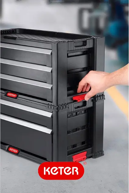 - Модуль для стеллажа Drawer Tool Chest System от Keter — функциональное и практичное решение для организации инструментов в гараже, подвале или на балконе. Для хранения более мелких деталей предусмотрены 16 съемных ячеек. Благодаря встроенным рукояткам ящики легко переносить