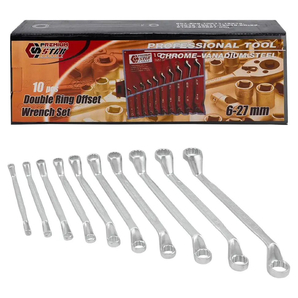 Ключи изготовлены из прочной хром-ванадиевой стали, что обеспечивает высокую износостойкость и долговечность. Изогнутая форма накидных головок облегчает доступ к крепежу в ограниченном пространстве.