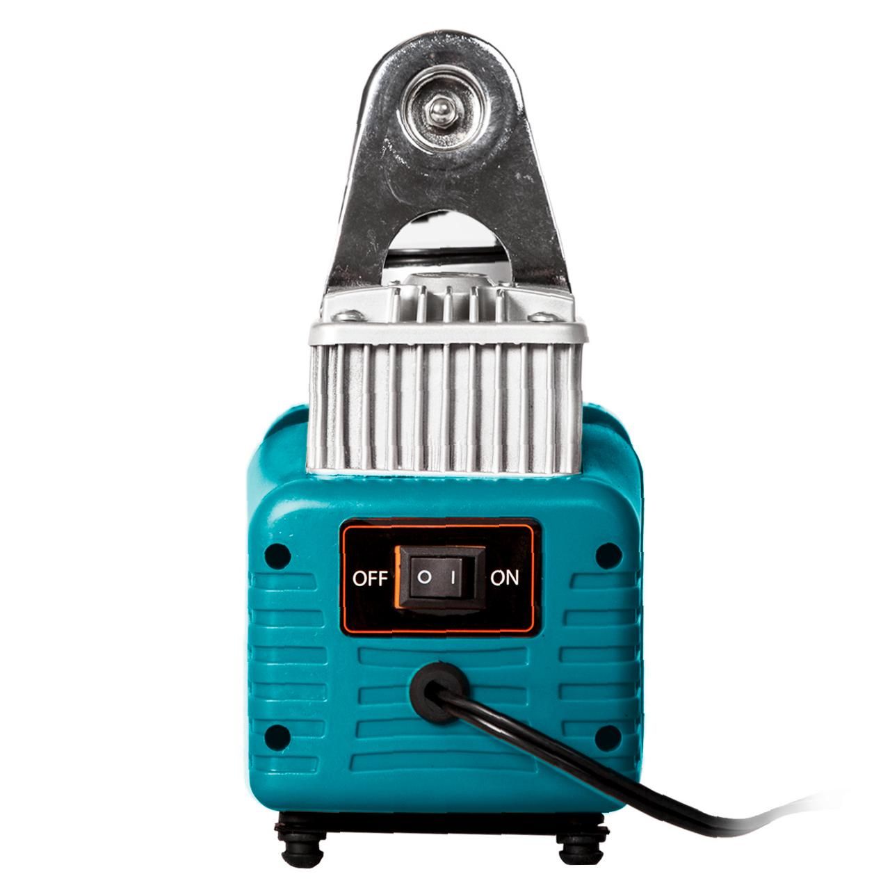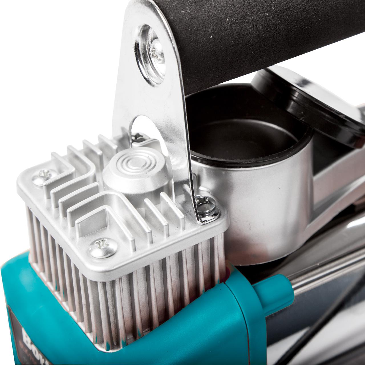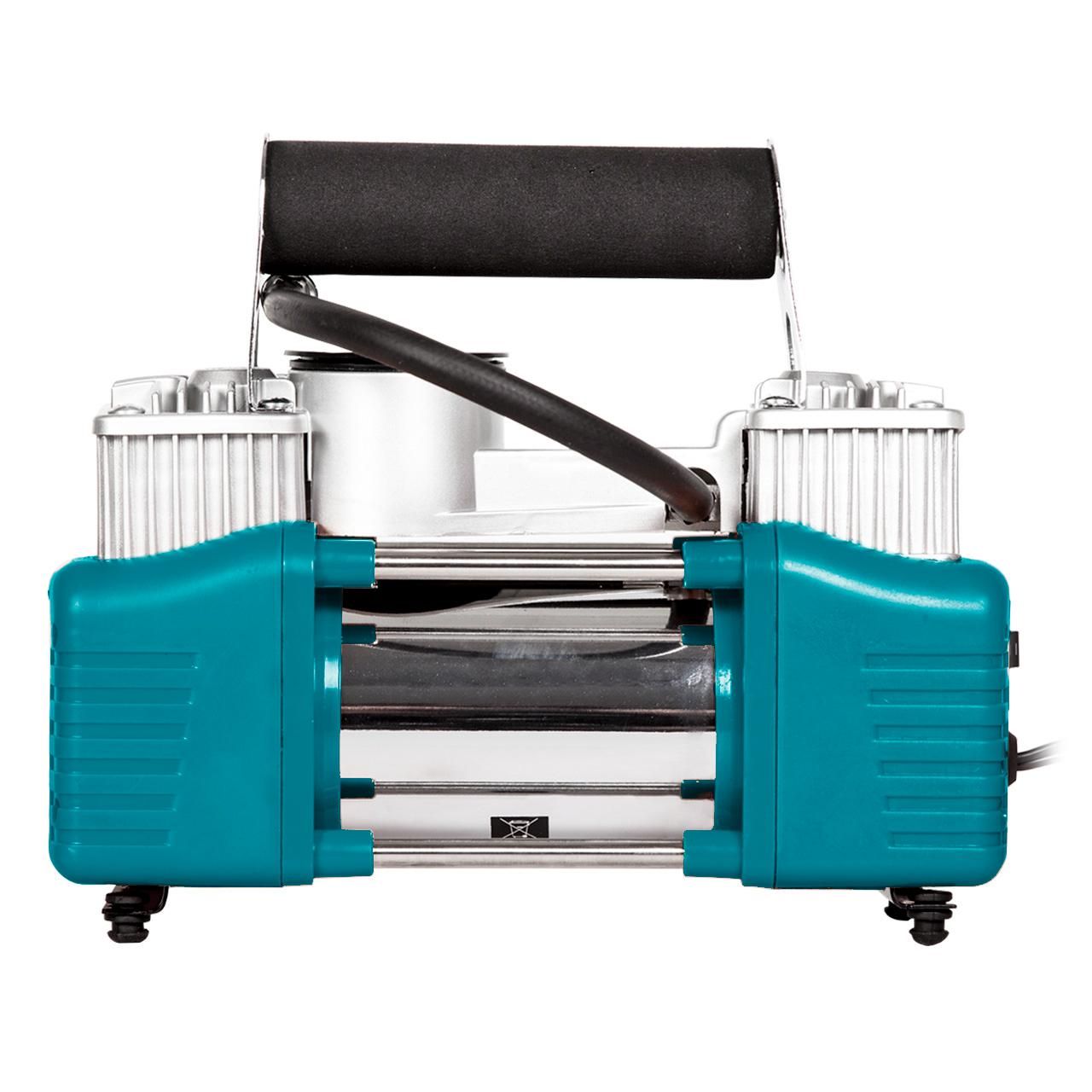- Мощный двухцилиндровый мотор поддерживает давление в 10бар и обладает высокой производительностью 70л/мин, чего вполне достаточно для накачивания автомобильных шин большого размера и надувного плота.