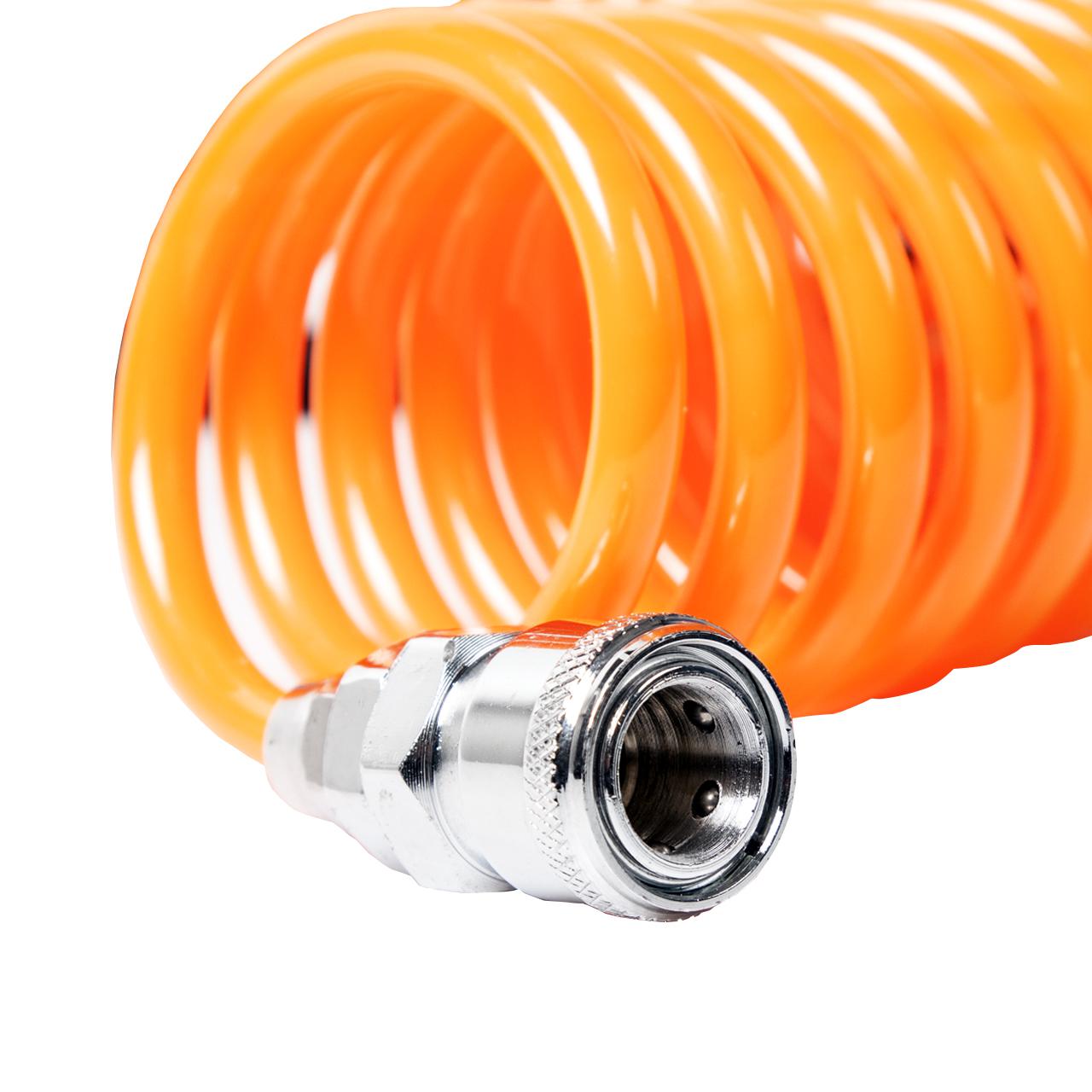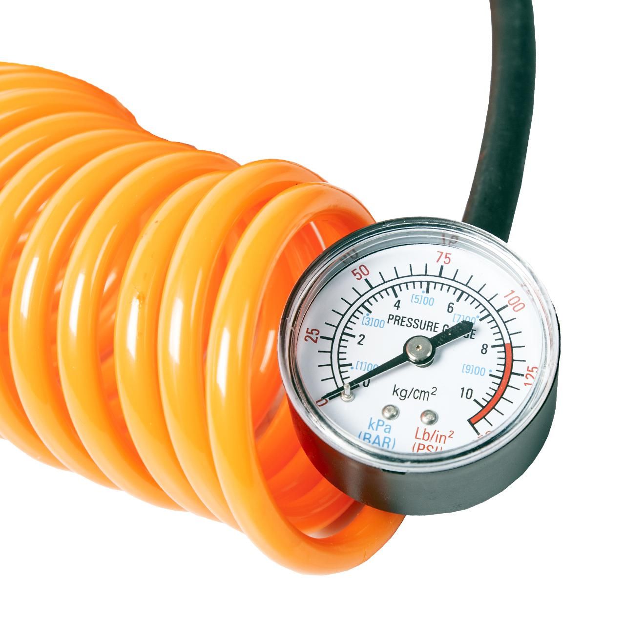 - В комплекте поставляется с удобной сумкой, шнуром с зажимами - «крокодилами» для подключения к аккумулятору, 3-мя насадками и спиральным шлангом длиной 5 м и манометром.