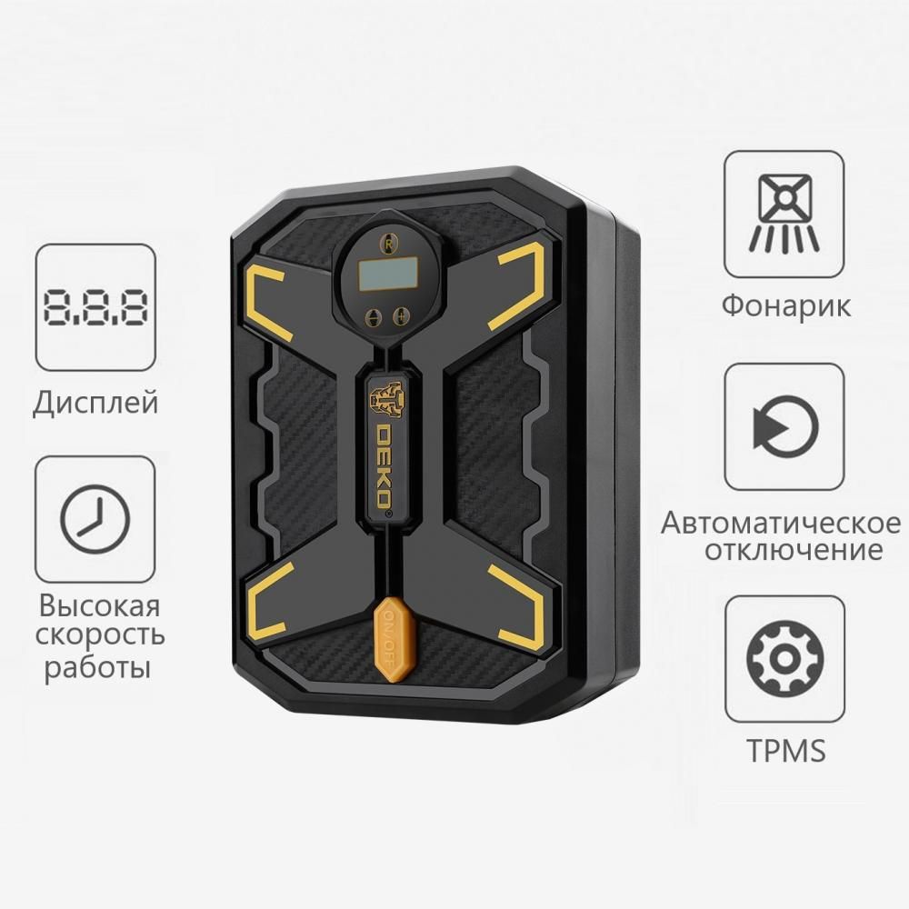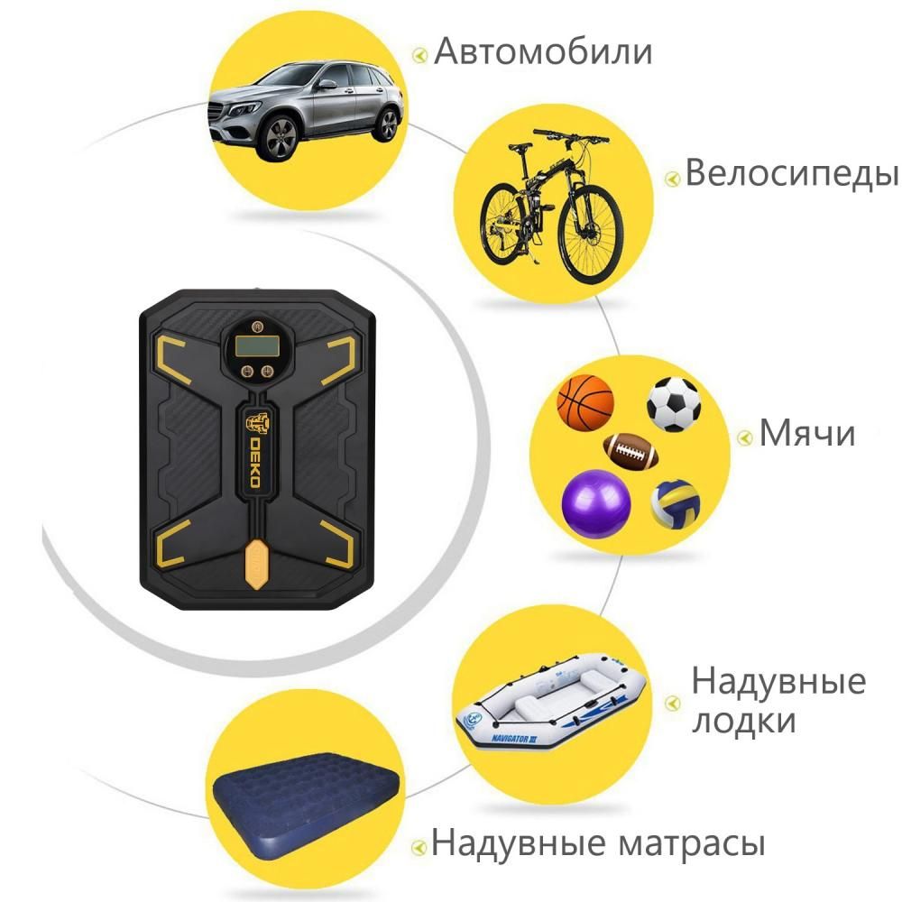 - Насос автомобильный цифровой Deko DKCP150Psi-LCD - современный прибор, который служит для накачки автомобильных, велосипедных и мотошин, резиновых лодок и спортивного оборудования.