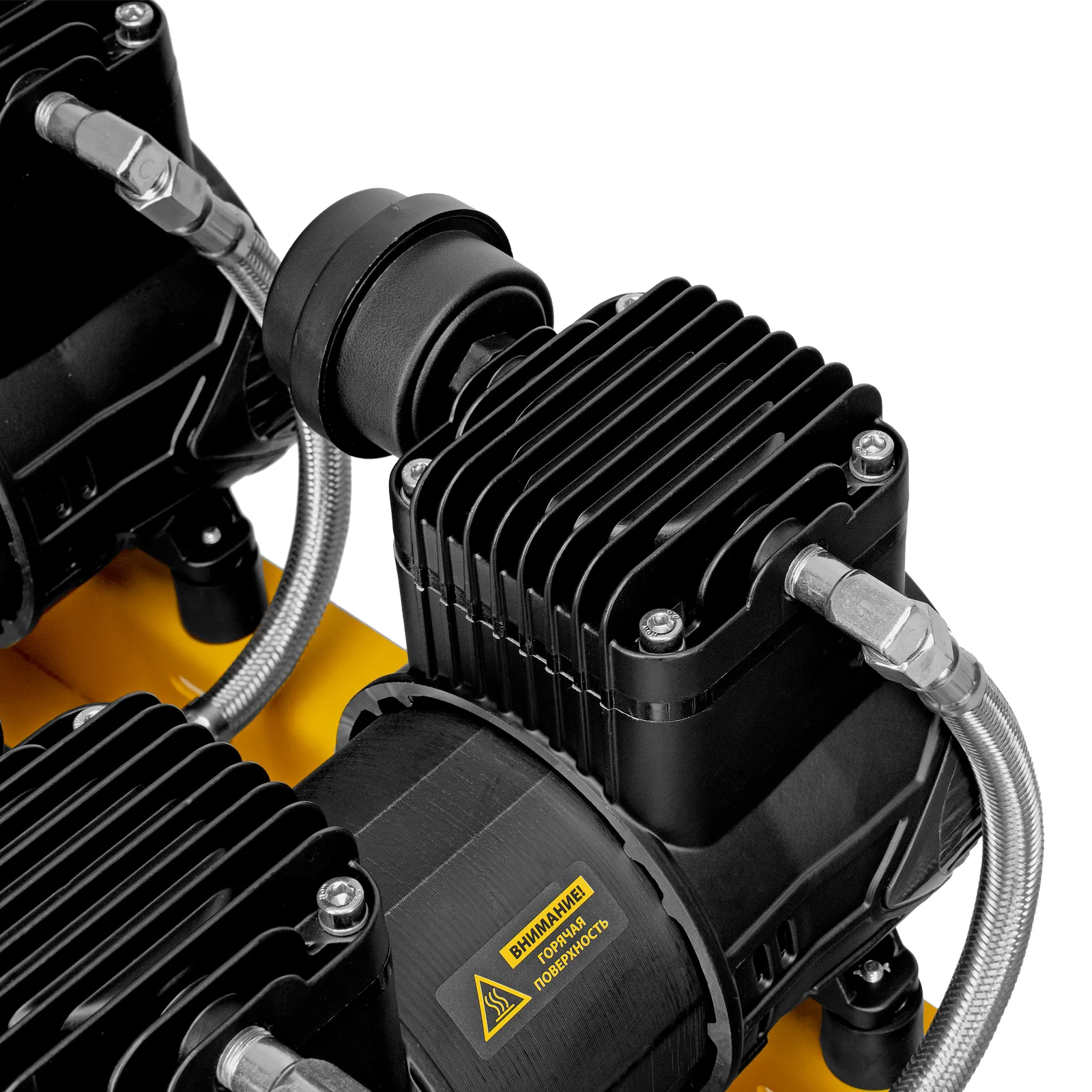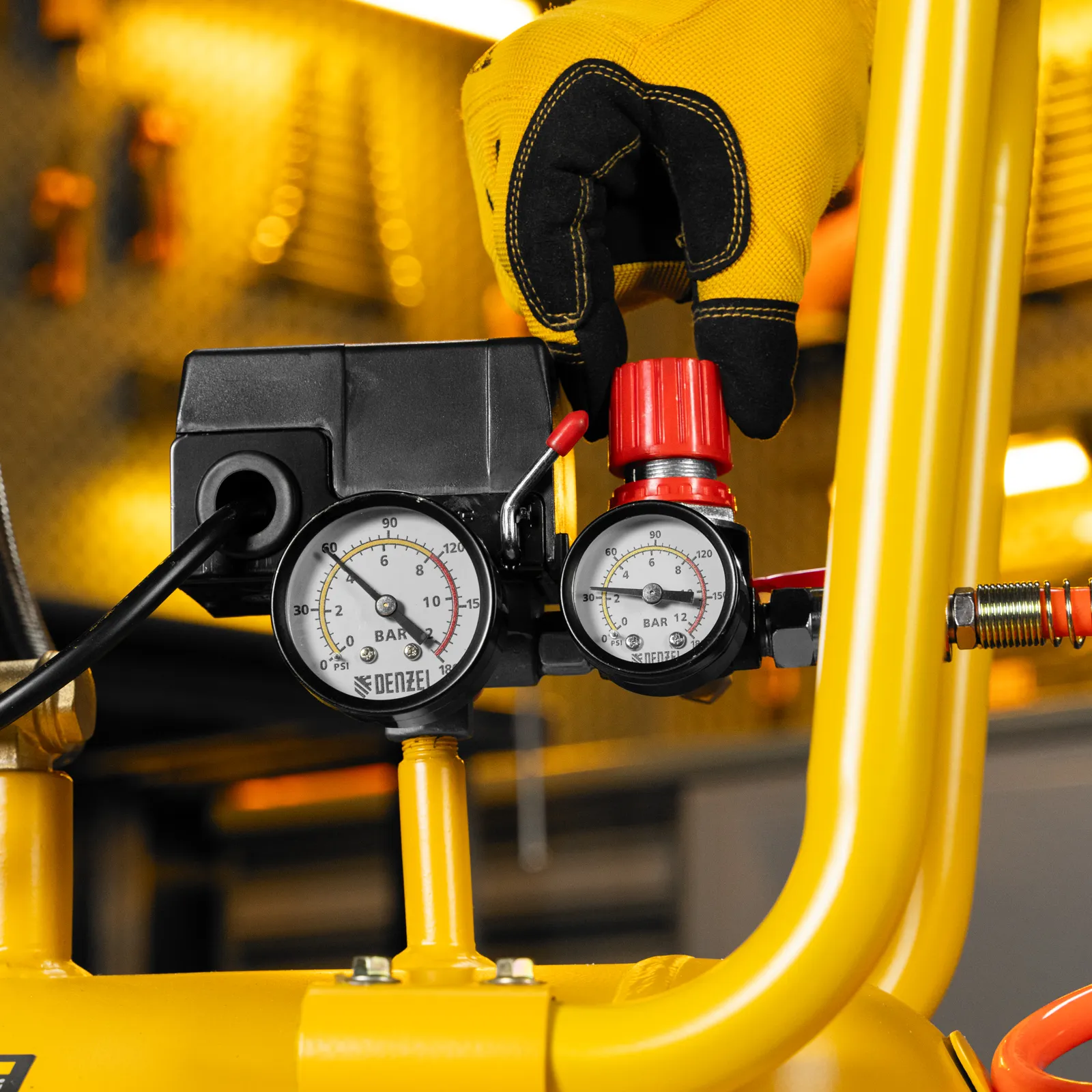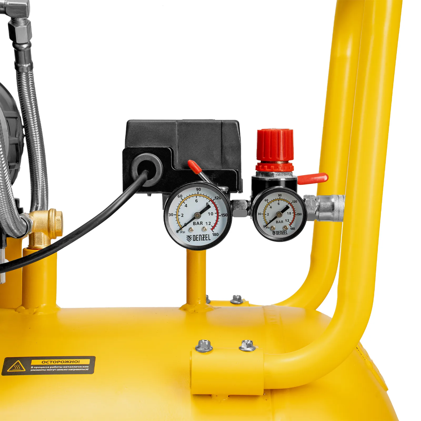- Контроль работы — компрессор оснащен 2 манометрами для отслеживания давления в ресивере и пневмолинии