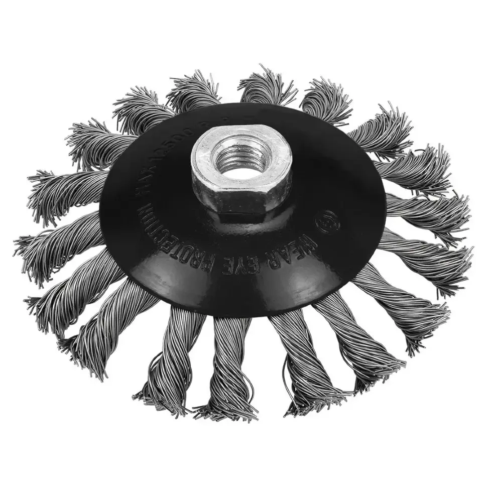 Кордщетка дисковая ''получаша'' стальная витая для УШМ применяется для шлифовки, полирования, зачистки сварочных швов. Форма ''получаша'' обеспечивает хорошую площадь прилегания к поверхности и предназначена для обработки больших плоскостей. Конструкция щетки имеет прочную конструкцию с усиленной гайкой, которая способствует предотвращению деформации изделия. Рабочая часть состоит из скрученной в пучки стальной проволоки. Применяется совместно с угловой шлифовальной машиной с посадочным размером М14. Максимальное количество об/мин 12500, диаметр предмета- 115 мм. Выполнена из стали, которая не подвергается коррозии и окислению.