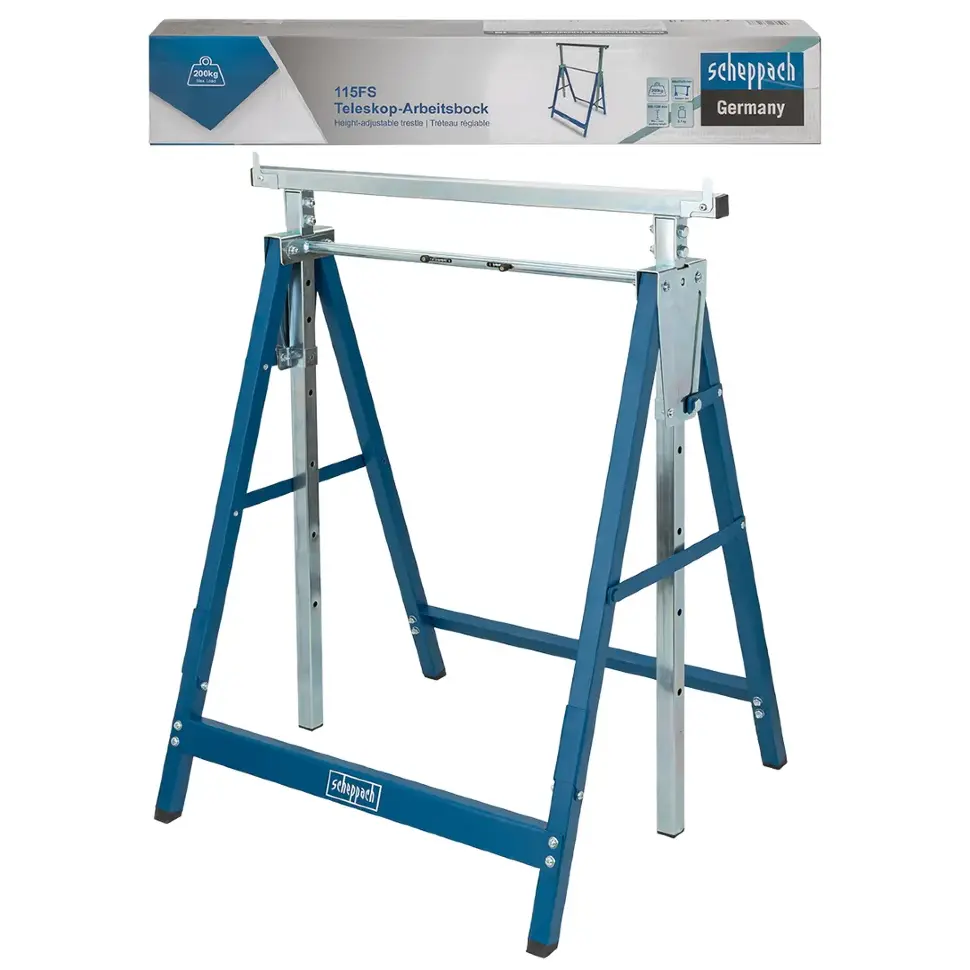 Модель Scheppach Sch‑115FS — это усиленные металлические козлы, рассчитанные на работу с заготовками и оборудованием весом до 200 кг.