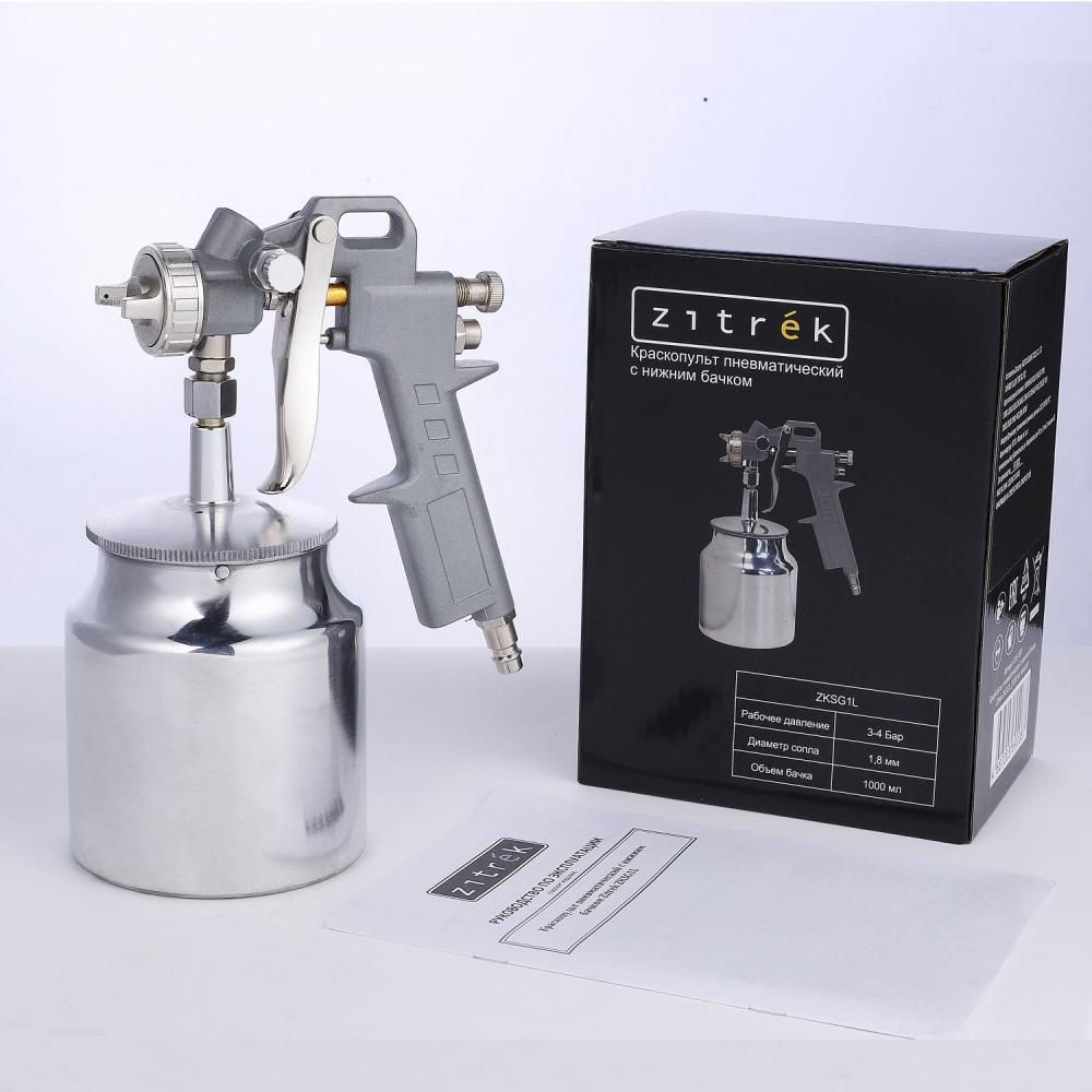 - Краскопульт пневматический с нижним бачком Zitrek ZKSG1L (1000 мл, металл) предназначен для нанесения краски и лака, а также содержащих растворители и разбавляемых водой эмалевых красок, прозрачных лаков, покрывных лаков для автомобилей, морилок, масел и других текучих материалов (распыляемых сред) на подходящие для этого объекты посредством сжатого воздуха.