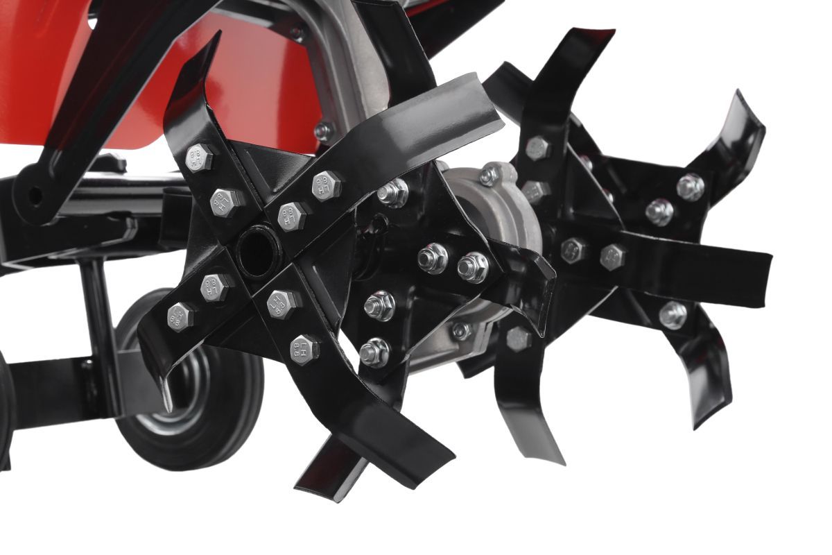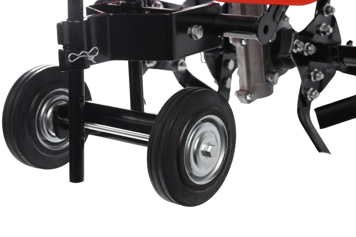 - Колёса расположены на сошнике. Перемещать агрегат удобно, даже когда он выключен, широкие шины не вязнут в земле.