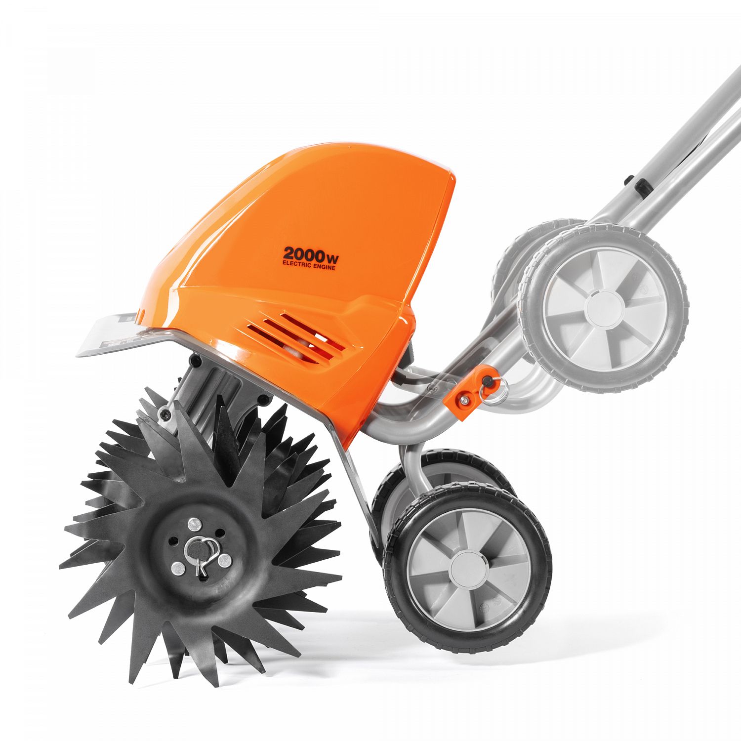 - Транспортировочные колеса. Упрощают перемещение культиватора к месту работ. Они оснащены системой быстрого перевода из режима транспортировки в рабочий режим и обратно.
