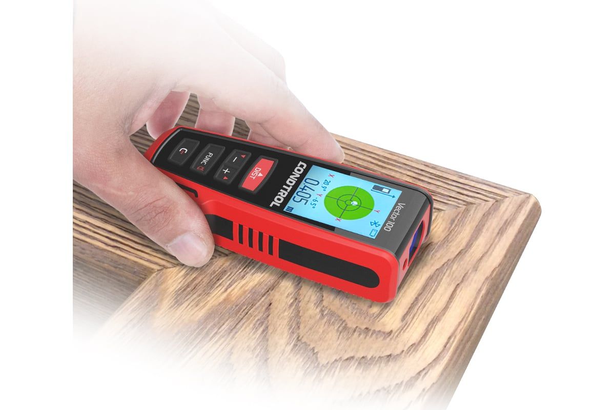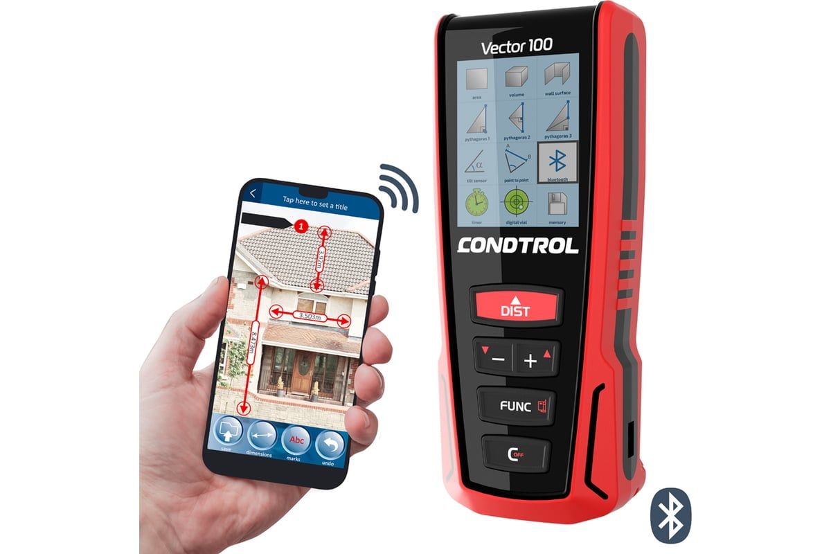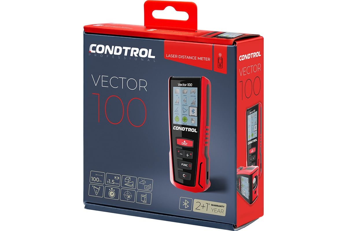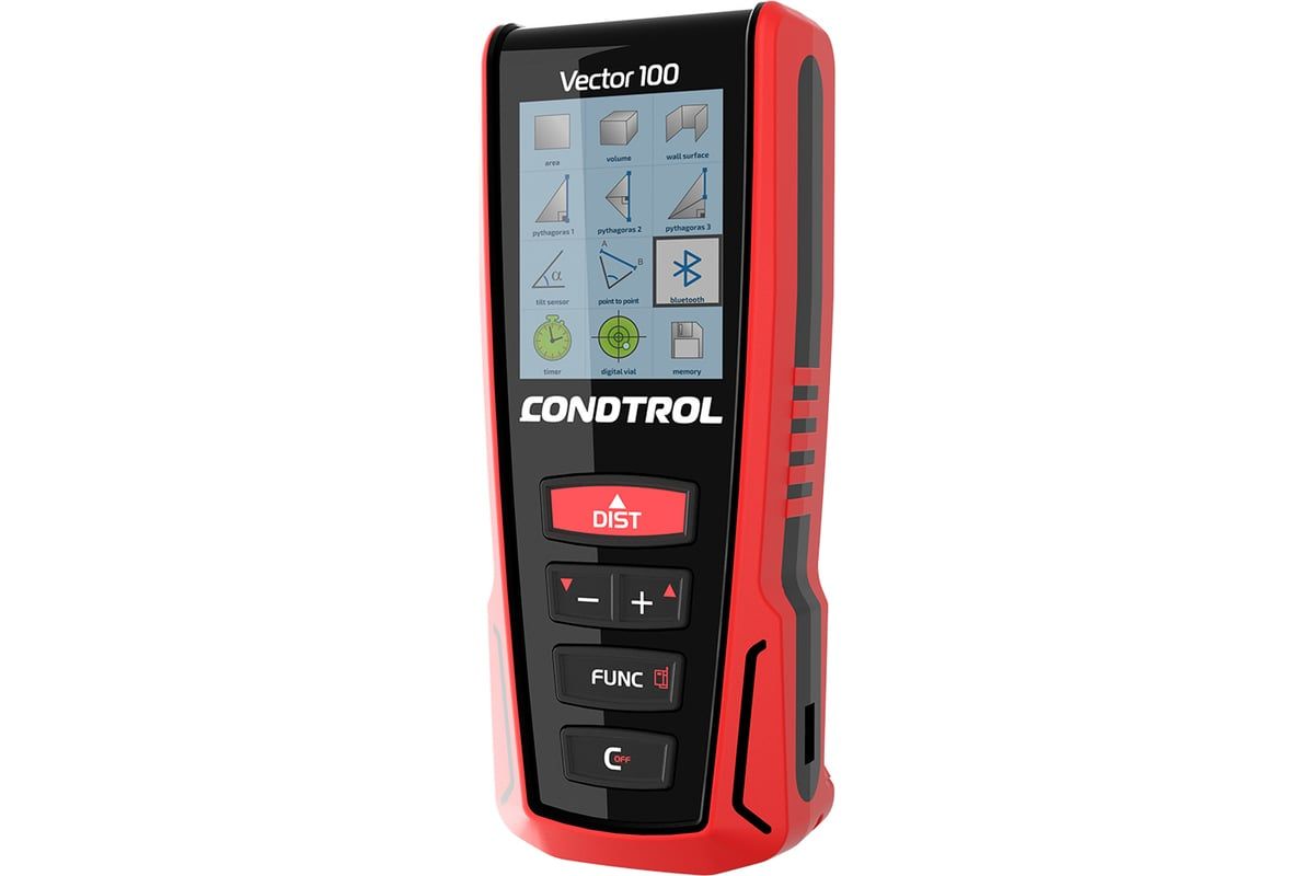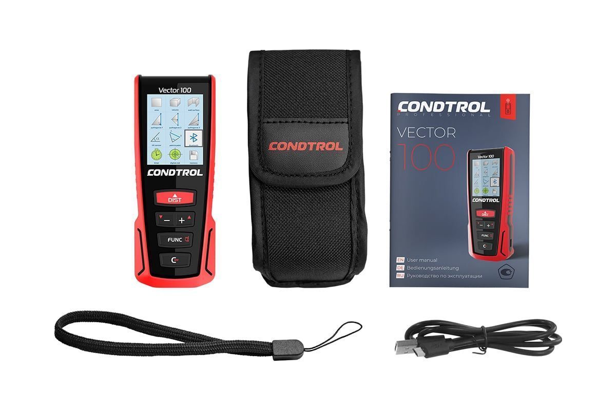 CONDTROL Vector 100 – профессиональный лазерный дальномер, предназначенный для быстрого и точного измерения расстояния до 100 м. Полноцветный дисплей с высоким разрешением обеспечивает комфортную работу при любых условиях освещения. Встроенный 3D-акселерометр поможет определить расстояние между двумя произвольными точками в пространстве, а функция Bluetooth вместе с приложением CONDTROL Smart Measure значительно увеличит возможности использования лазерной рулетки.