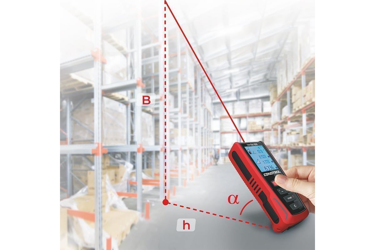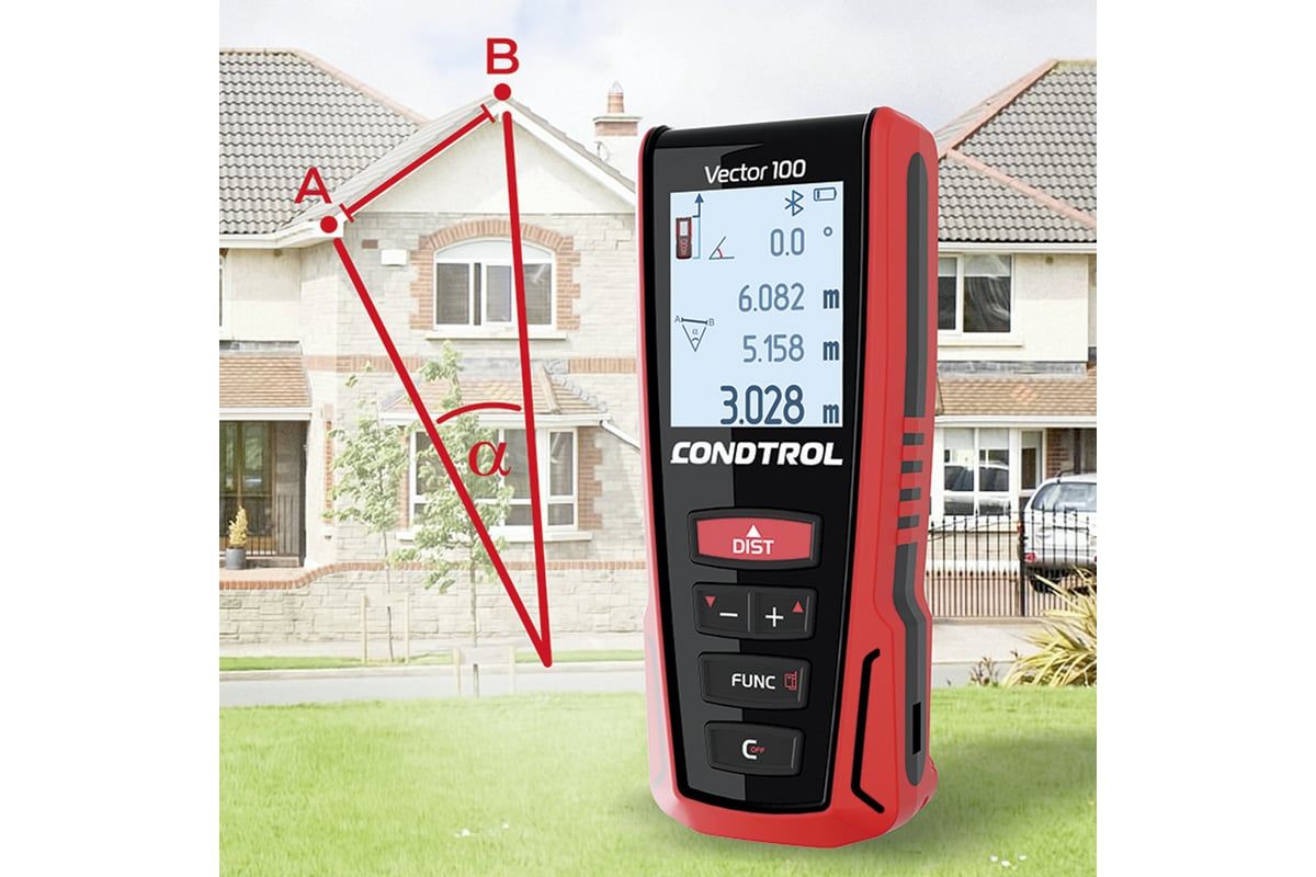 Одно из главных достоинств лазерного дальномера CONDTROL Vector 100 – возможность измерения расстояния между двумя произвольными точками в пространстве. Это достигается благодаря встроенному 3D-акселерометру, позволяющему всего по двум замерам определить длину отрезка, проходящего сквозь здания или препятствия (стена, деревья, забор).