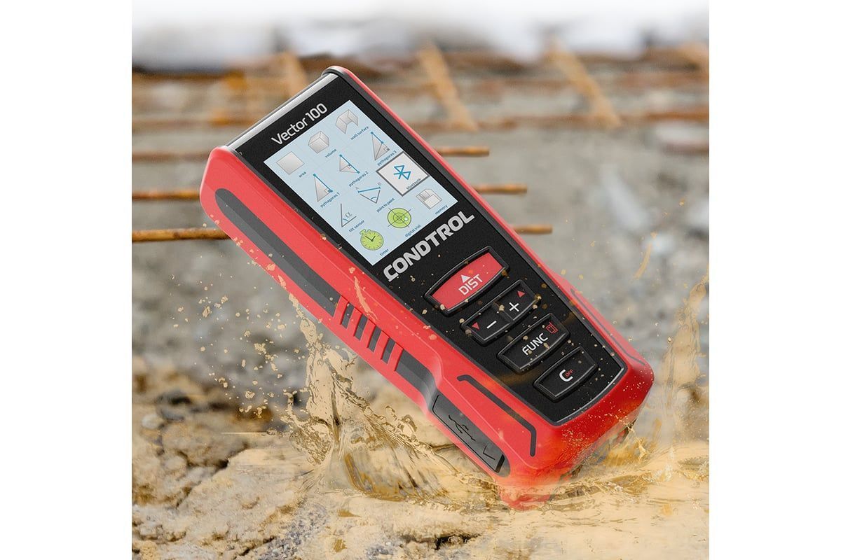 Благодаря герметичному корпусу, лазерная рулетка надежно защищена от брызг воды и пыли. Большие силиконовые кнопки не потрескаются на морозе, их удобно нажимать даже в перчатках. Это позволяет использовать CONDTROL Vector 100 в условиях стройплощадки.