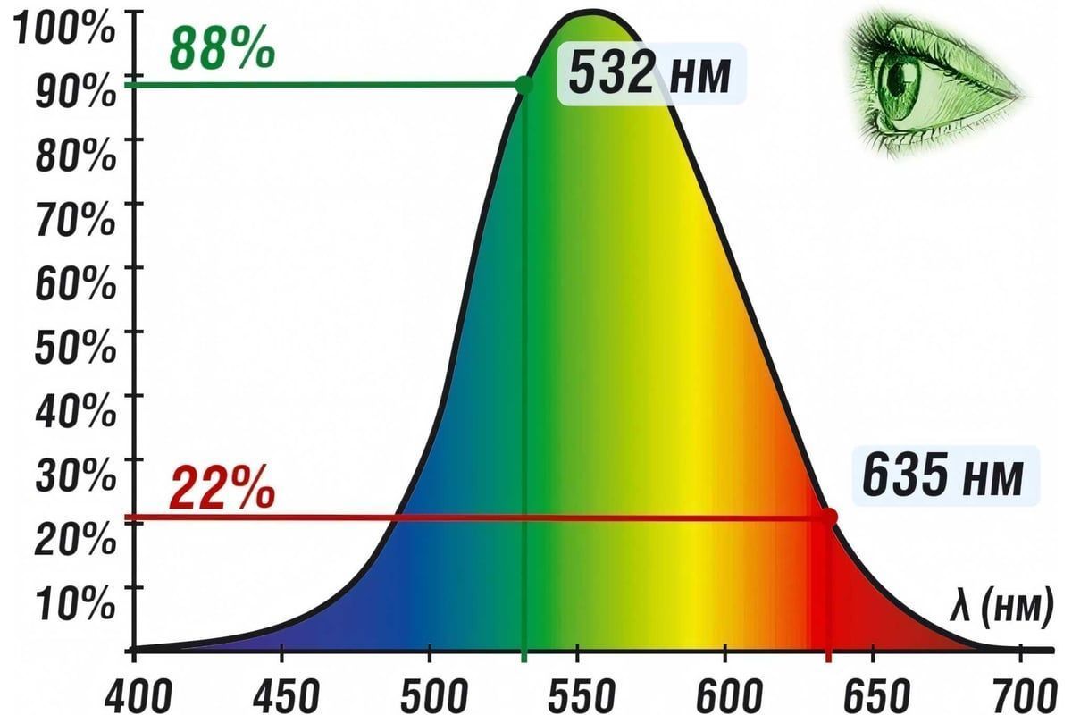 Все нивелиры новой серии Neo G оснащены зеленым лазером с длиной волны 532 нм, которые воспринимаются в 4 раза ярче красных при одинаковой мощности излучателя. Это связано со спектральной чувствительностью человеческого зрения, что наглядно демонстрирует график.