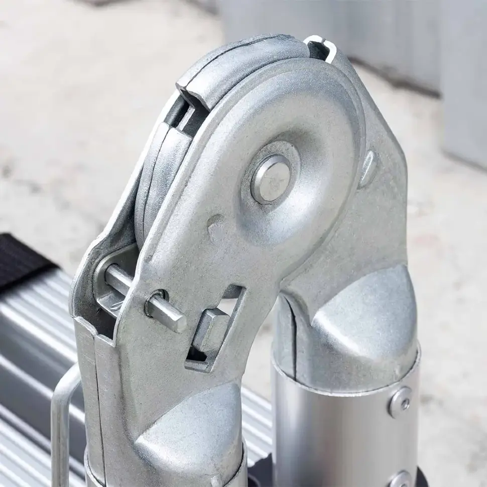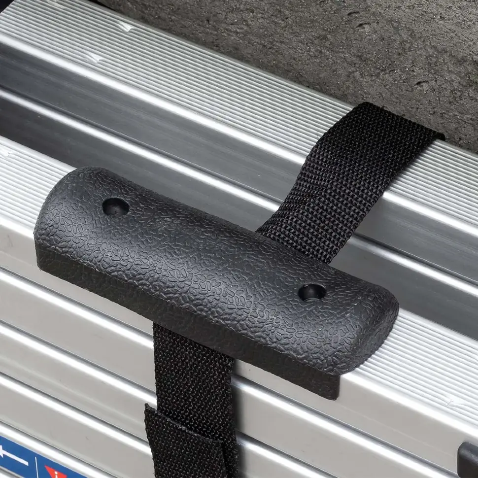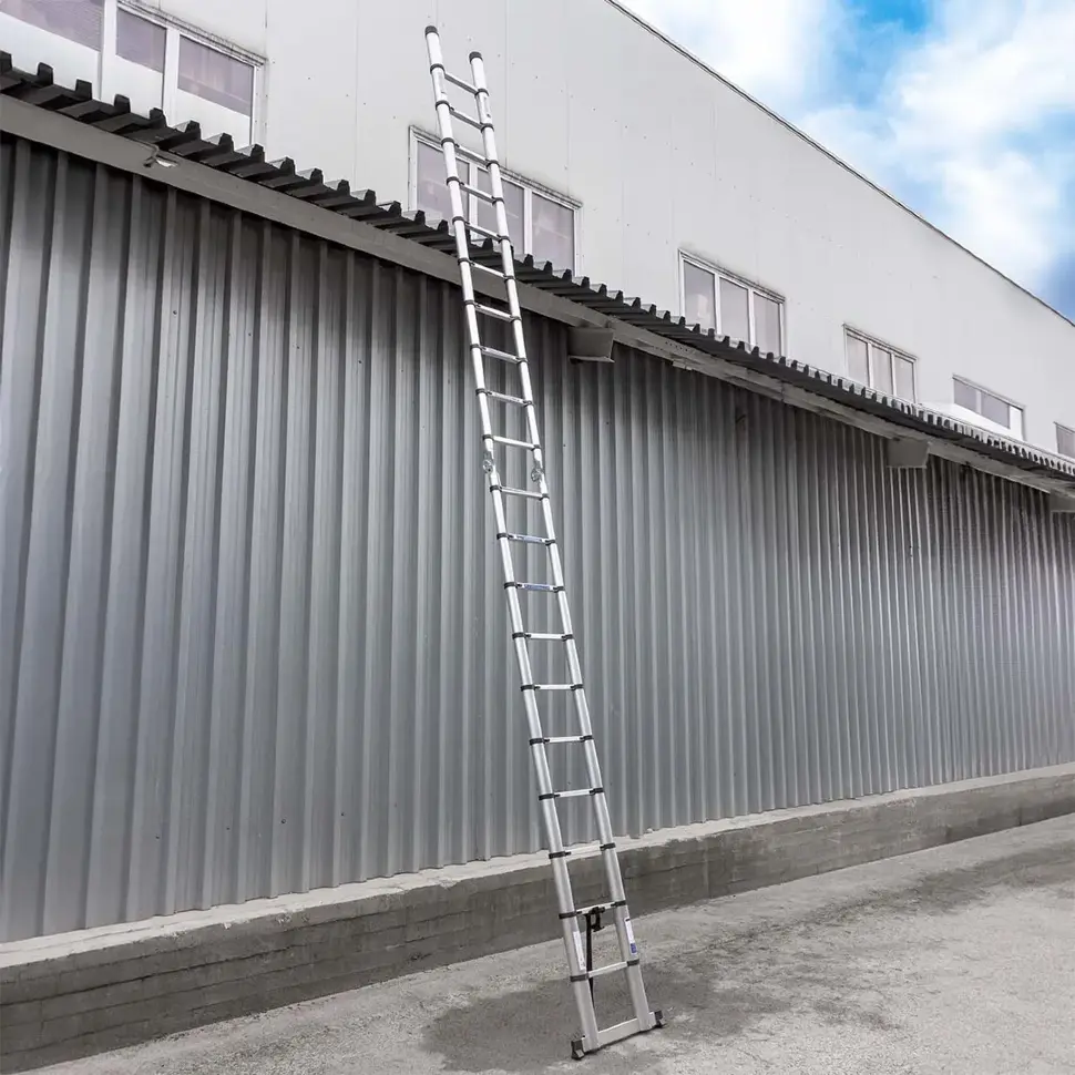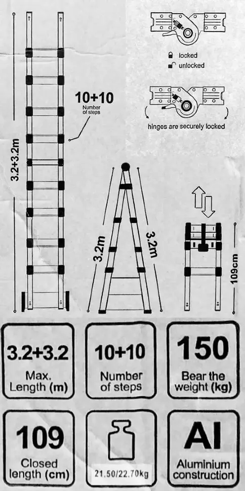 Модель состоит из двух секций по 3,2 м с односторонним восхождением, что позволяет использовать её как стремянку или как приставную лестницу. Прочный анодированный алюминий обеспечивает лёгкость конструкции и устойчивость к коррозии, а надёжные замки ступеней и противоскользящие наконечники повышают безопасность при работе.