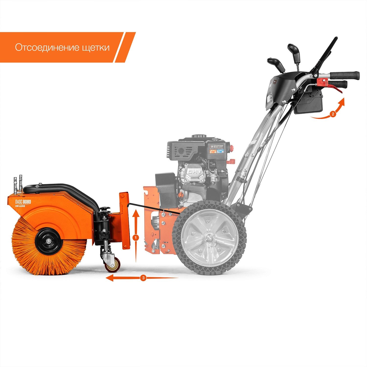 • Классический снегоуборщик. Роторный снегоуборщик DASC 560T приобретается отдельно. - Прочная Полимерная щетка 80 см. Щетка вращается со скоростью 288 об/мин и убирает снег до основания. Встроенная система регулировка высоты позволяет выбрать интенсивность очистки. Возможность быстрой замены изнашиваемых частей.