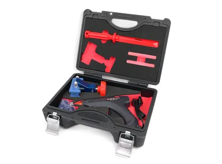 Рихтовочный набор, включающий 3 молотка с фибергласовыми ручками и 4 оправки, предназначен для исправления геометрии элементов автомобильного кузова. Наковальни и ударные головки имеют различную форму, что позволяет работать с деталями разной степени кривизны. Набор используется в автомастерских.