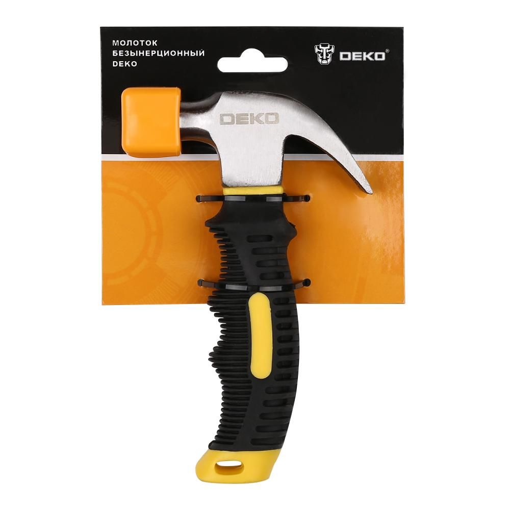 Безынерционный молоток Deko — ручной инструмент для механических, столярных работ и демонтажа. Изготовлен из цельнометаллической заготовки. Сочетает в себе плоскую рабочую часть, с одной стороны и загнутый гвоздодер, с другой. Гвоздодер имеет острые концы и заточен изнутри, что позволяет извлечь гвоздь, который наглухо ушел в изделие. Рабочие части подвергнуты индукционной закалке. Обрезиненная рукоятка не позволяет выскальзывать инструменту из рук и глушит вибрацию во время удара, руки меньше устают.