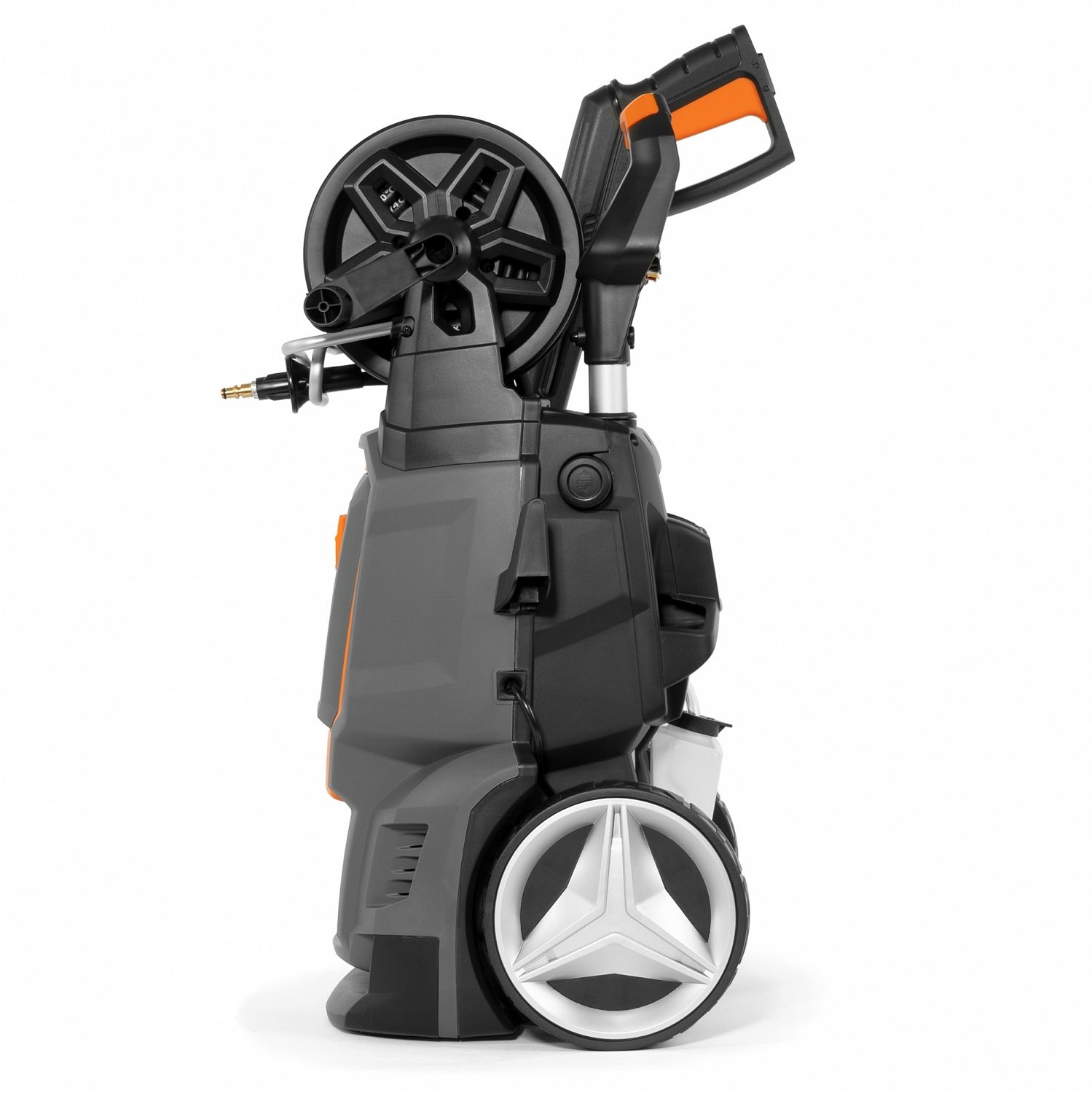 - Барабан для шланга. Позволяет аккуратно хранить 8 метров шланга. Облегчает размотку шланга, до необходимой длины. Шланг высокого давления аккуратно наматывается на барабан, благодаря направляющей.