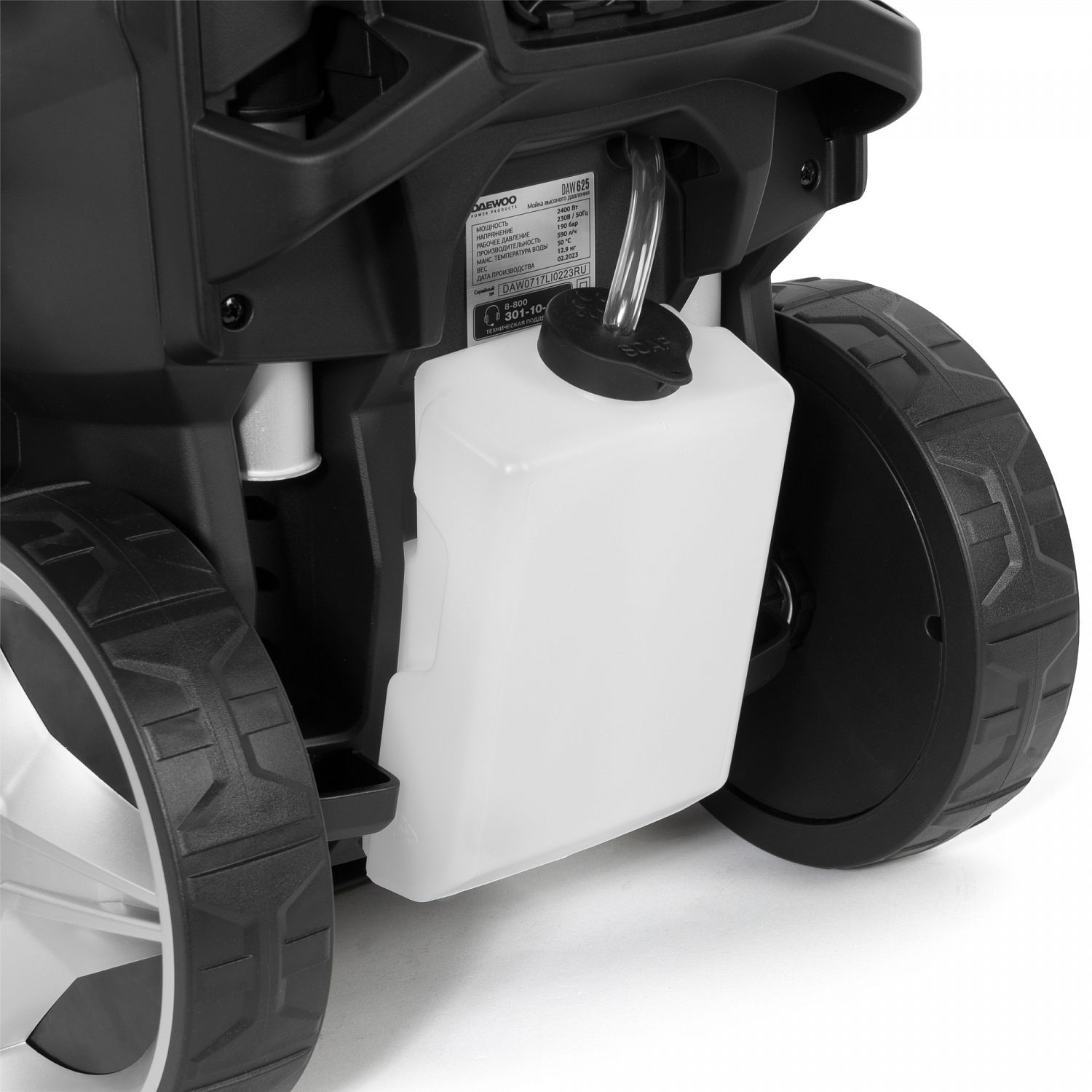 - Встроенный бак для моющего средства. Емкость для моющих средств встроена в корпус мойки, благодаря чему нет необходимости останавливать работу для смены насадок.