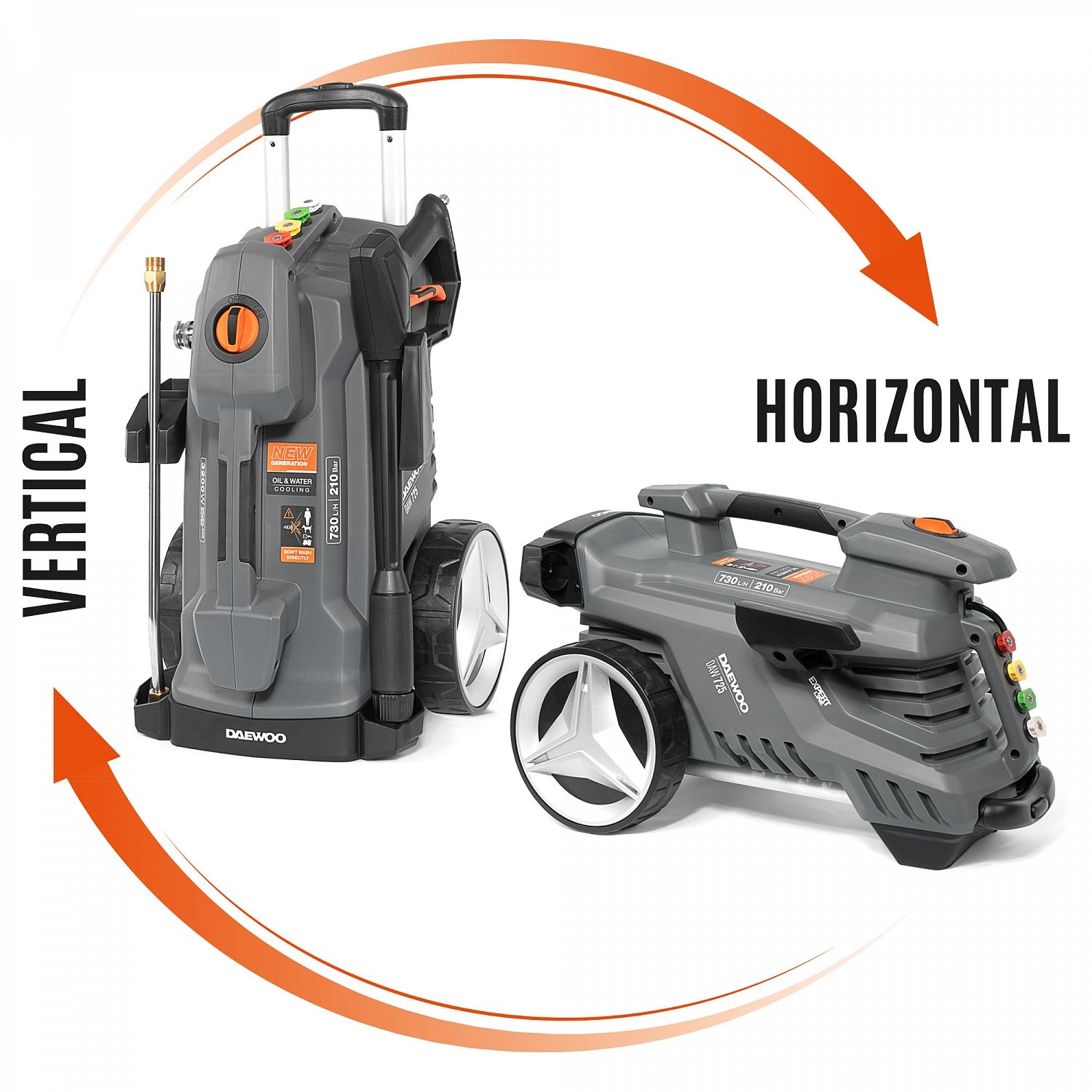 - Любой режим эксплуатации 2 в 1. Благодаря особой конструкции, агрегат в процессе работы может находиться в вертикальном или горизонтальном положении. Этим обеспечивается мобильность и универсальность агрегата при его использовании в условия стройки, на мойке или при высотных работах.