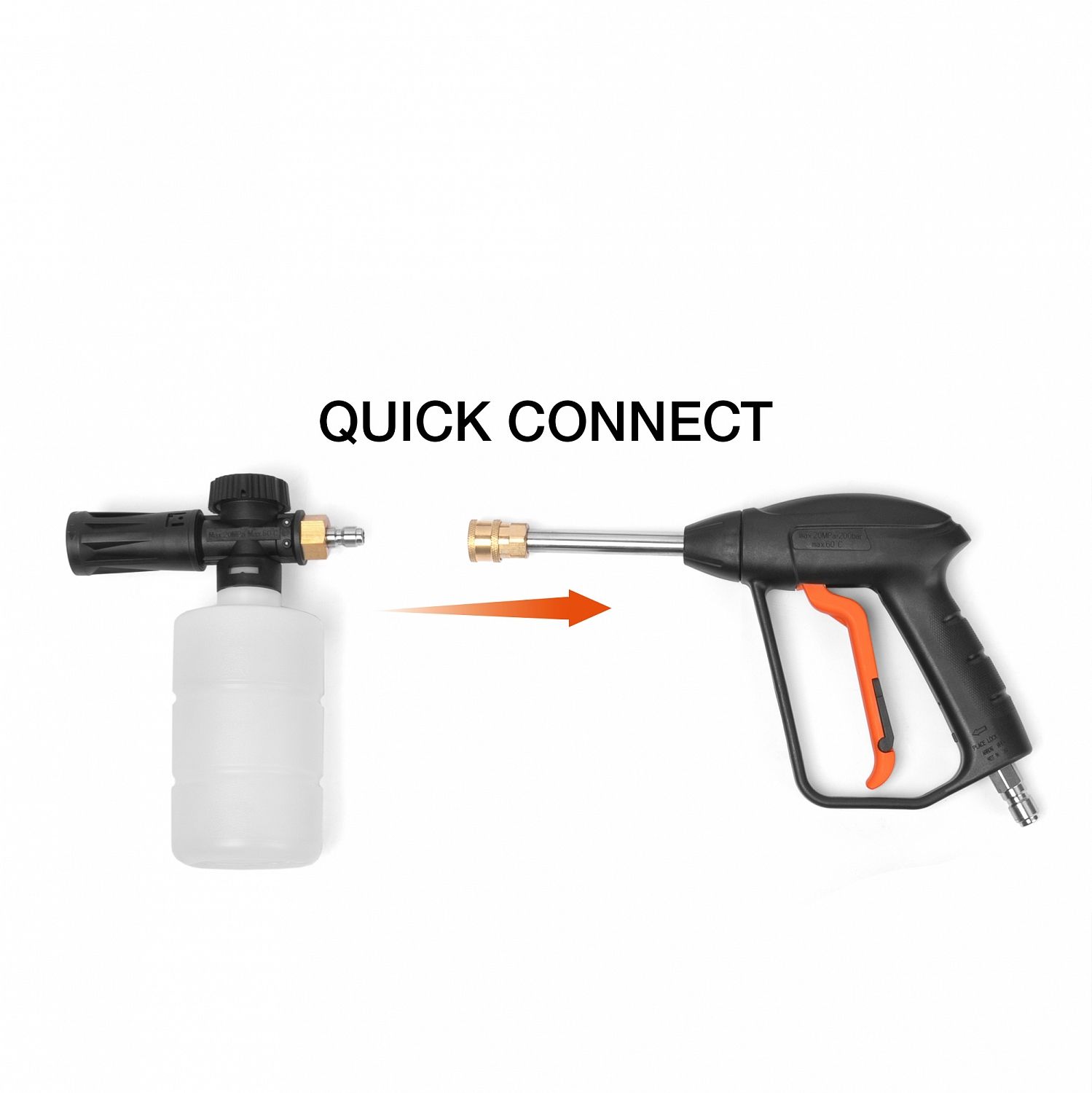 - 2-ой укороченный пистолет. Входит в комплект поставки и предоставляет удобное применение пеногенератора с подключение в один клик. Укороченный пистолет прекрасно подходит для мытья арок машины и работает со всеми насадками которые идут в комплекте. Обратный перевод на основной пистолет производится также в один клик.