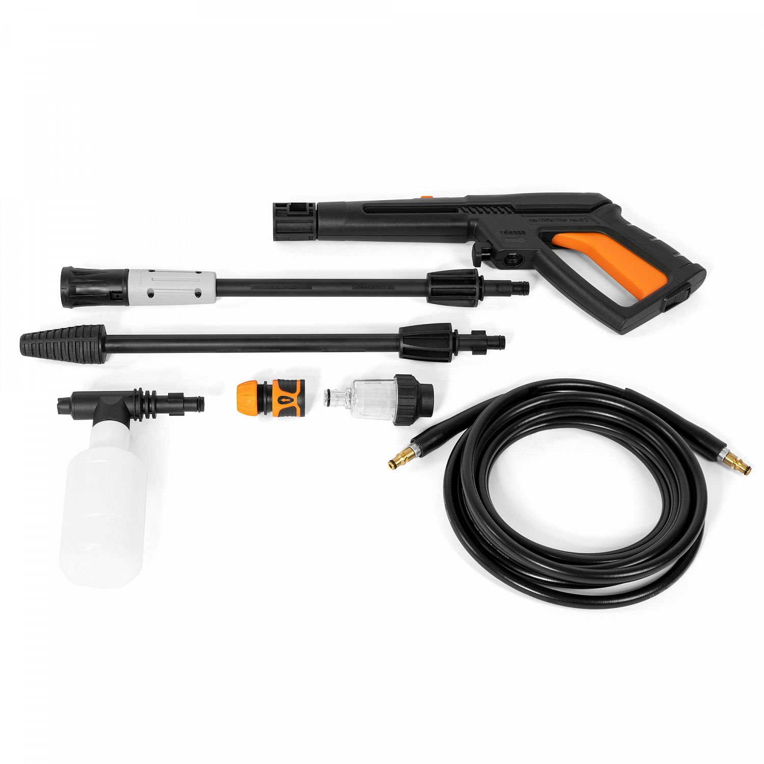 ✔ Встроенный генератор пены. Емкость для моющих средств встроена в корпус мойки, благодаря чему нет необходимости останавливать работу для смены насадок. Подача пены активируется переключателем, расположенным на корпусе мойки.