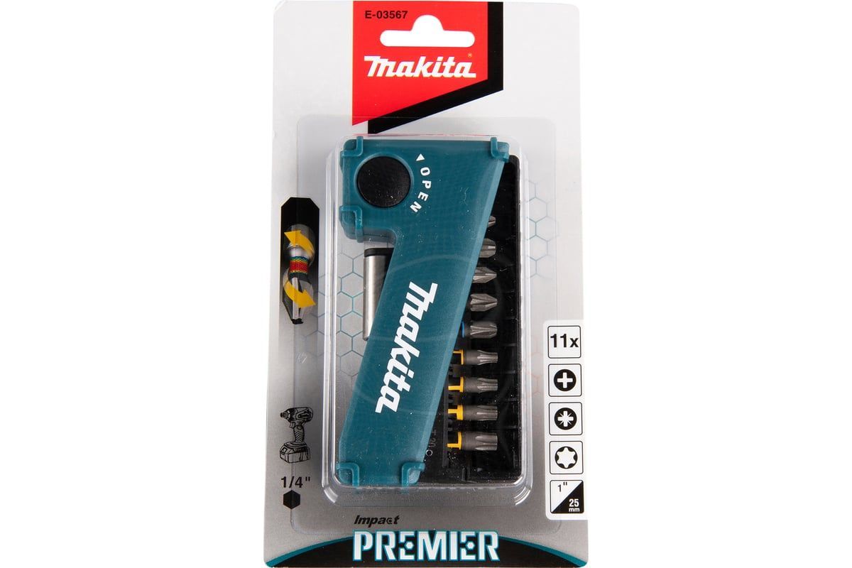 Набор ударных бит Makita Impact Premier является следующей ступенью в развитии серии Impact Gold. Данный набор включает в себя биты Phillips, Pozidriv, Torx, а также магнитный держатель. Данные биты рекомендованы для ударных инструментов и тяжелых условий эксплуатации.