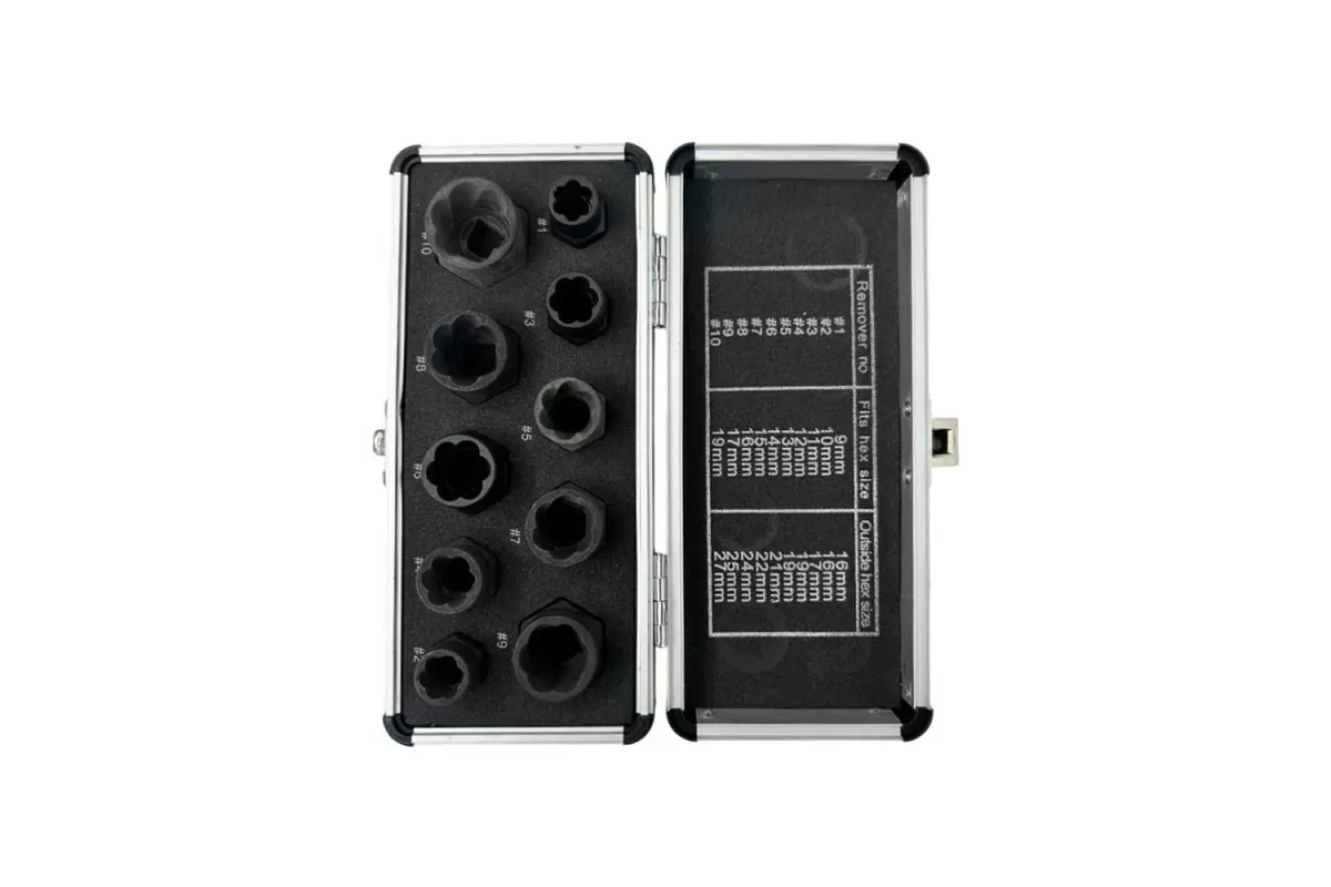 Универсальный комплект для извлечения вышедшего из строя или сломанного крепежа: болтов, гаек, шпилек и штифтов в условиях автосервиса и гаража. Набор включает 10 экстракторов разных размеров с левосторонней спиралью для надёжного захвата и эффективного удаления повреждённого крепежа.