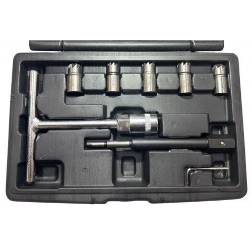 Набор фрез для чистки и восстановления посадочных мест дизельных форсунок из 8 предметов в кейсе используется для очистки и ремонта уплотнительных поверхностей дизельных форсунок. Изготовлен из высококачественной стали - крепкий и надежный инструмент. Комплектация: Т-образный ключ 19 мм., держатель центрирующий режущую головку, фреза универсальная 15 x 19 мм., фреза для форсунок 17 x 17 мм. (Delphi/Bosch (PSA/Renault/Ford), фреза 17 x 17 мм. (для Mercedes-Benz CDI), фреза для форсунок Bosch 17 x 19 мм. (для Mercedes CRD), фреза 17 x 21 мм. Fiat/Iveco, ключ Г-образный, ключ Г-образный, кейс. Набор подходит для большинства дизельных двигателей легковых автомобилей, микроавтобусов и небольших грузовиков. Подойдет идеально для СТО, гаража и частным владельцам. Для удобства хранения и транспортировки поставляется в прочном пластиковом кейсе.