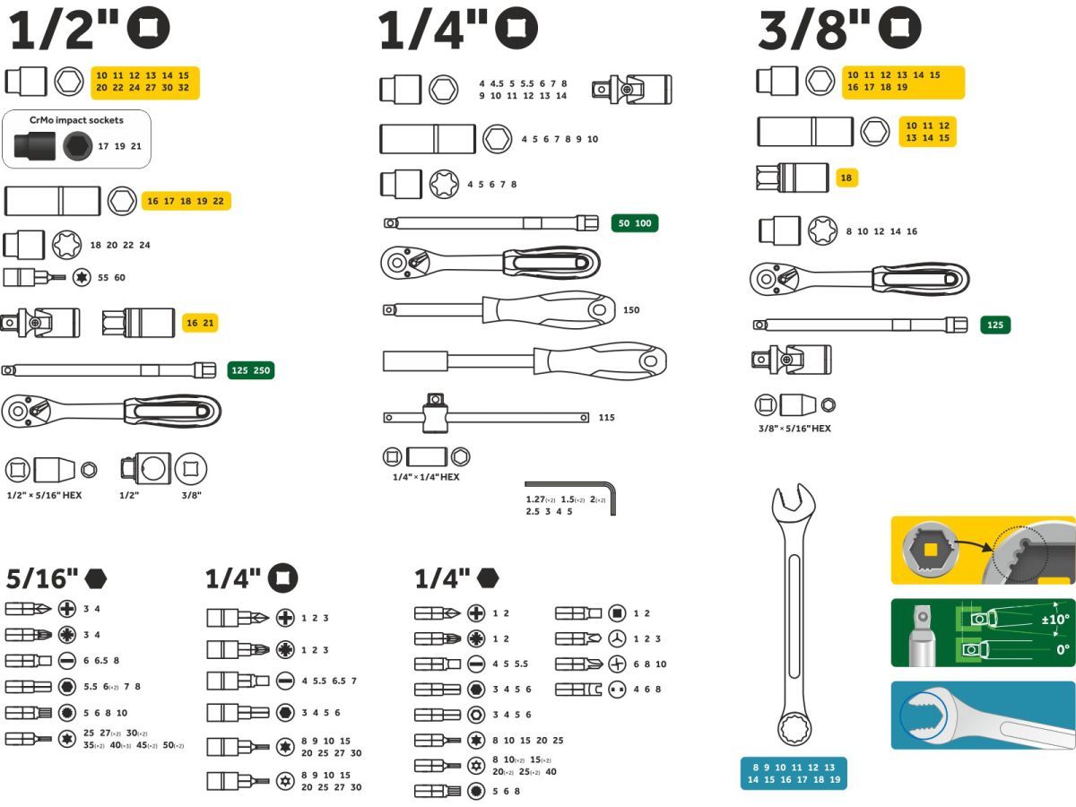 + Головка торцевая 3/8": 10, 11, 12, 13, 14, 15, 16, 17, 18, 19 мм;