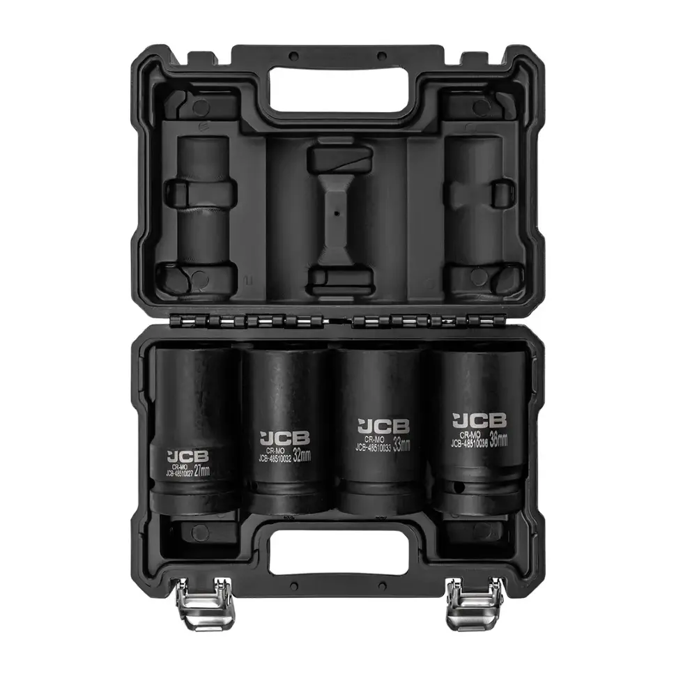 Набор головок ударных глубоких 4пр.,1"(6-гр)(27,32,33,36мм),в кейсе JCB JCB-8041-5MPB — комплект из четырёх 6‑гранных торцевых головок с посадкой 1″, предназначенных для работы с крупным крепежом под высокими нагрузками.