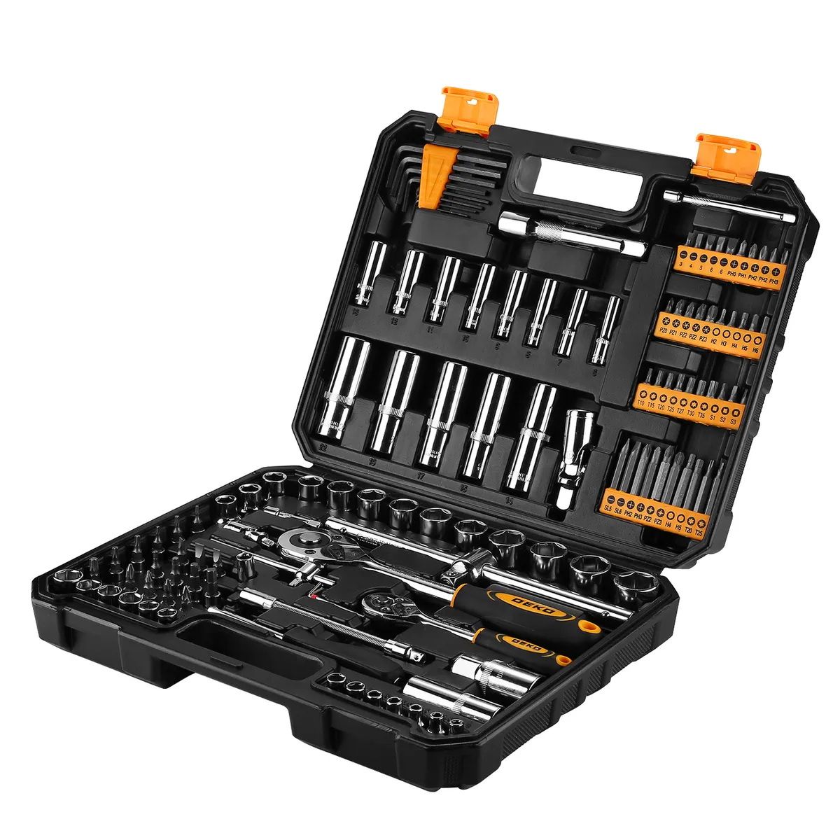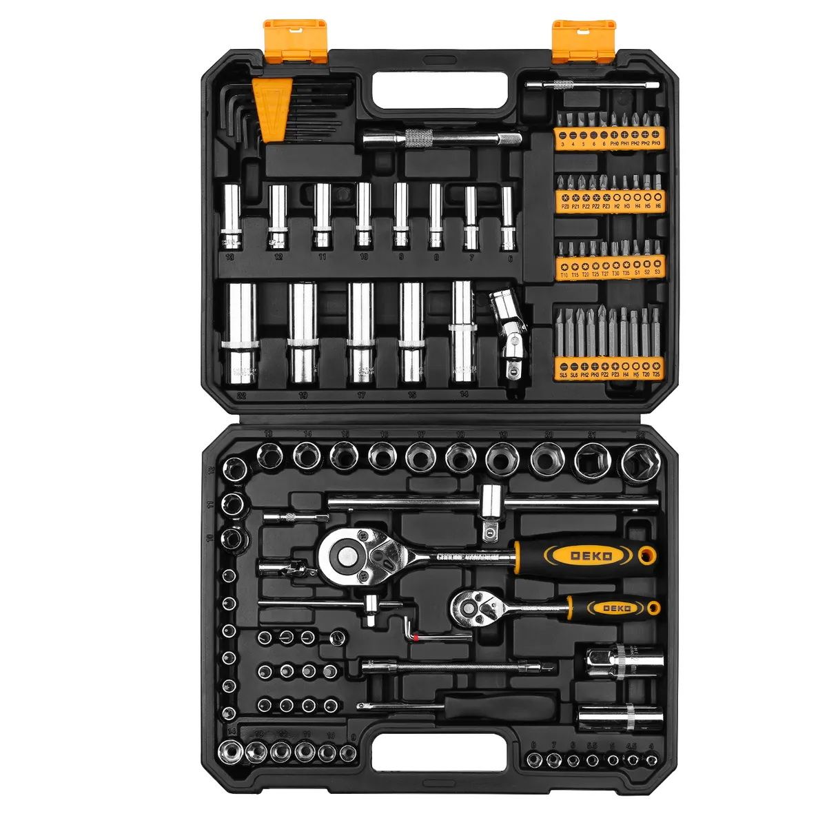 - Набор инструментов для авто DEKO DKAT121 (121 предметов) предназначен для автосервиса, гаража и слесарных мастерских.