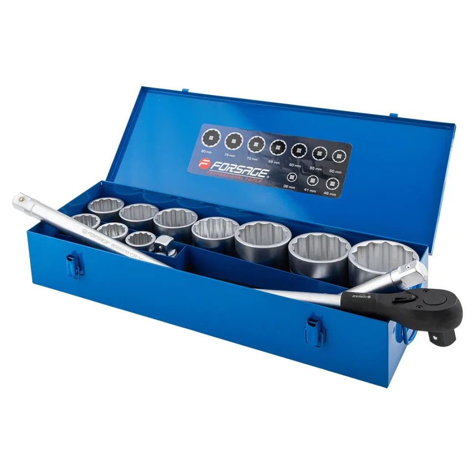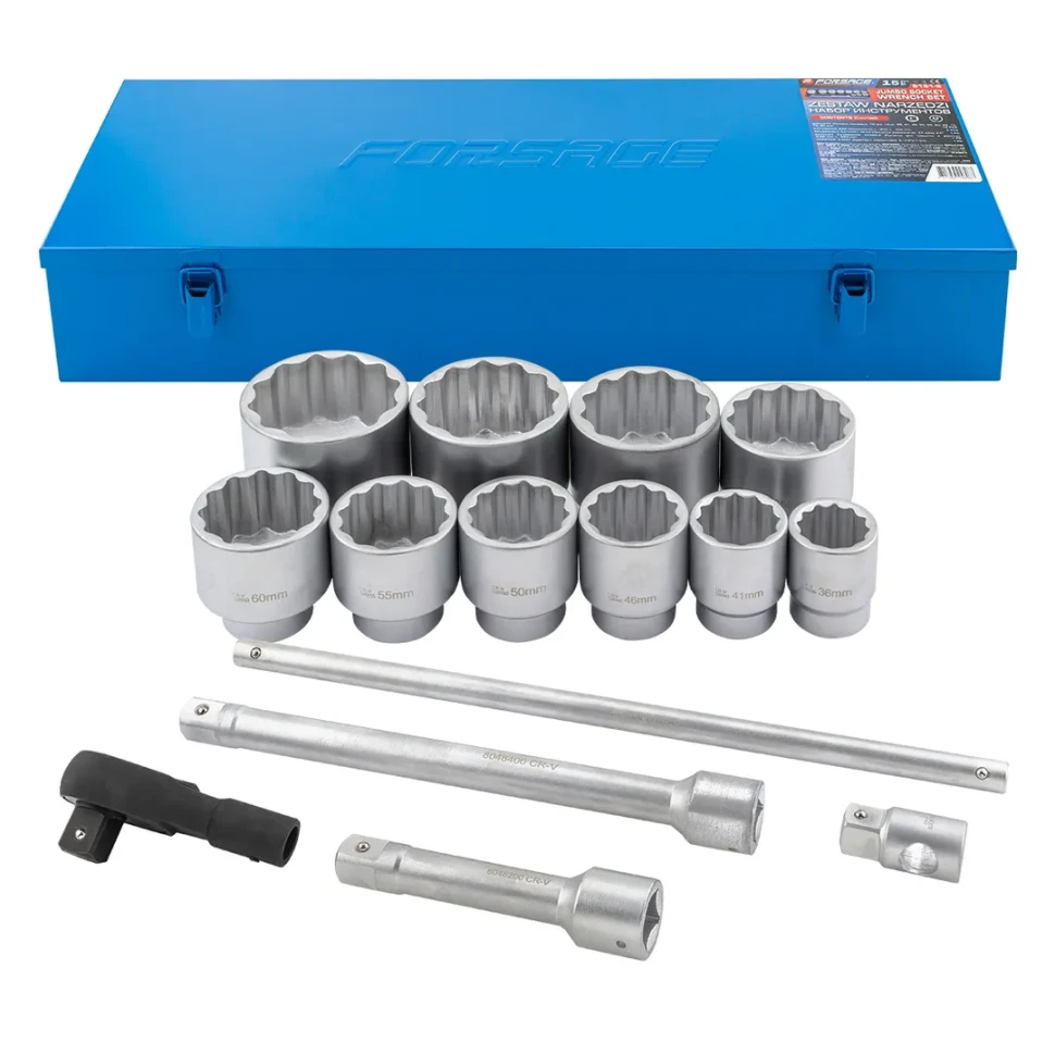 Набор инструментов Forsage, модель 8151-9 из 15 предметов с посадочным квадратом 1" и двенадцатигранным профилем (12pt) предназначен для выполнения тяжёлых монтажных, демонтажных и ремонтных работ с крупным крепежом.