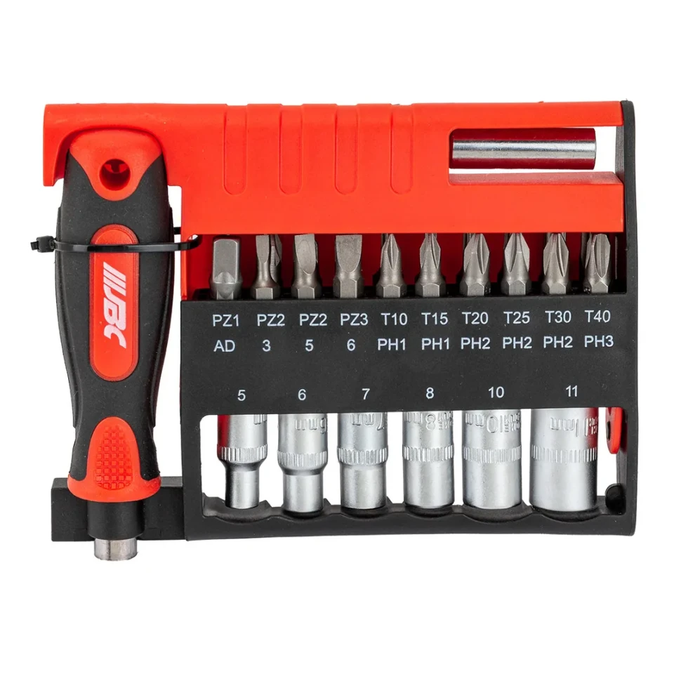 Набор головок и бит JBC - это универсальный комплект профессионального инструмента, предназначенный для монтажа и демонтажа резьбовых соединений с помощью шуруповёртов, дрелей или ручных трещоток. В набор входят 6 головок с посадочным квадратом 1/4" размером 5, 6, 7, 8, 10 и 11 мм, а также набор бит размером 1/4"×25 мм, включающий наиболее востребованные типы насадок для работы с различными типами крепежа.
