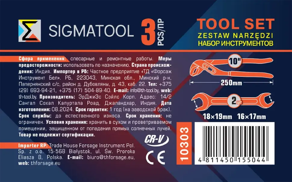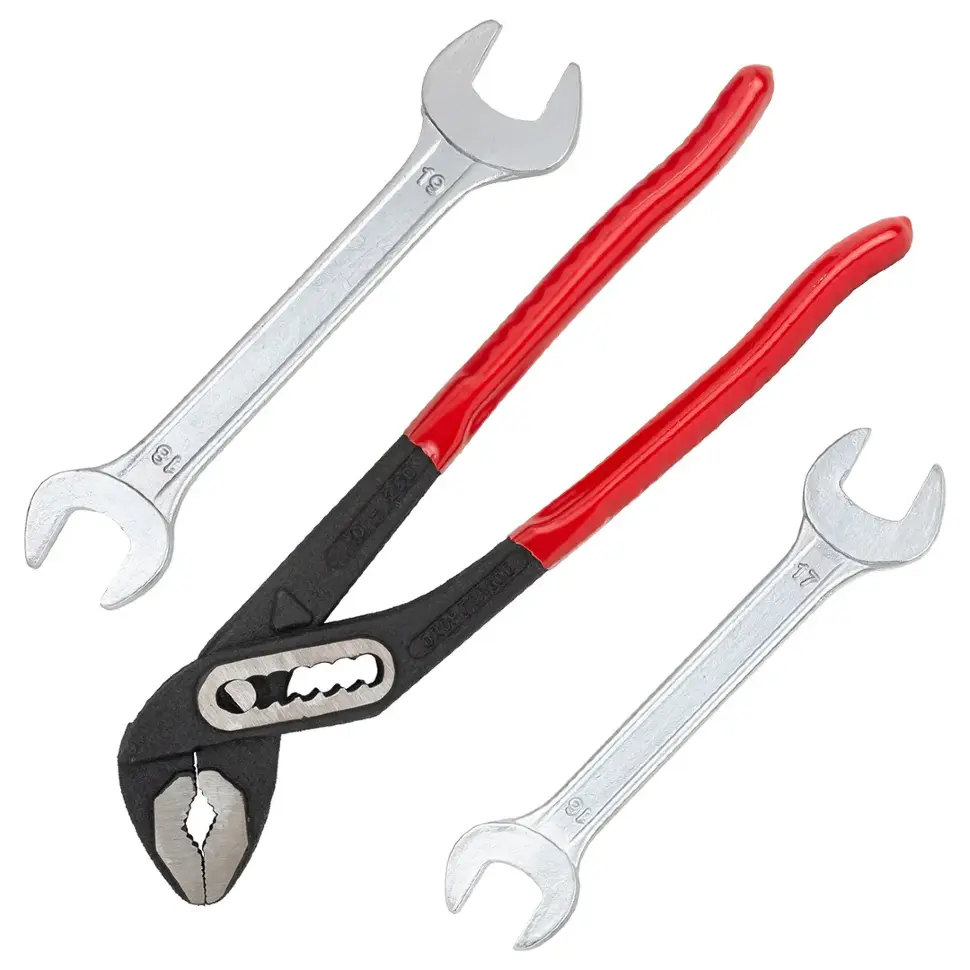 Рожковые ключи: 16х17, 18х19 мм;Переставные пассатижи 10" (250 мм).
