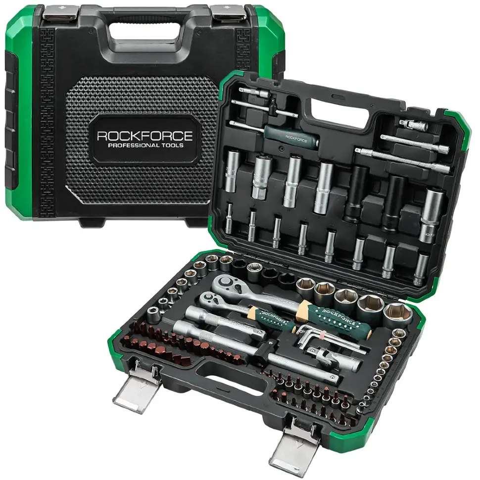 Набор инструментов RockFORCE RF-4941-5 GOLD — это универсальный комплект из 100 предметов (94 + 6), предназначенный для широкого спектра монтажных и демонтажных работ. Подходит как для автосервиса, так и для домашней мастерской. Включает посадочные квадраты 1/4" и 1/2", а также шестигранные головки (6pt) стандартной и глубокой формы.