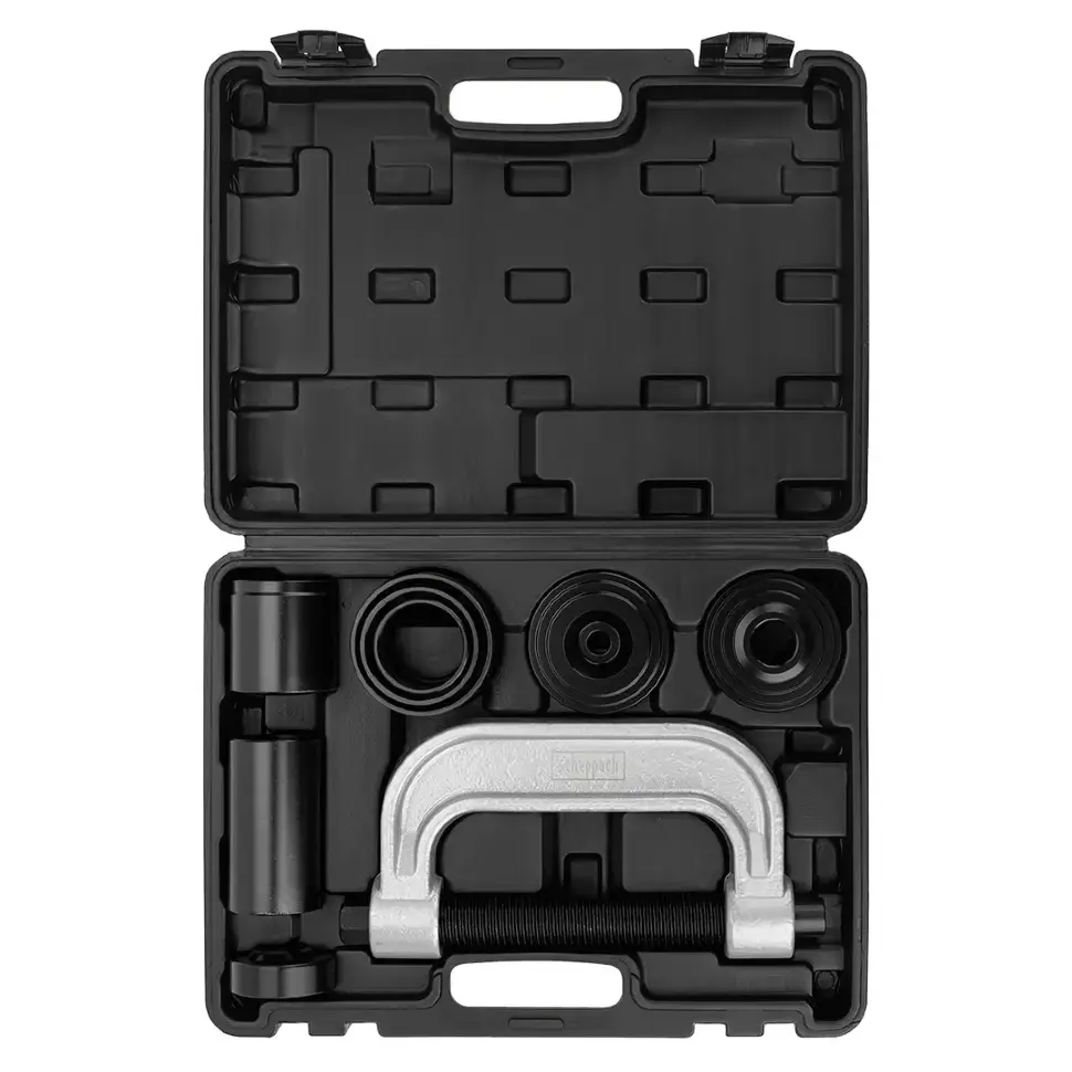 Основой набора является С‑образный ручной пресс, обеспечивающий равномерное усилие и снижающий риск повреждения деталей. В комплект входят оправки и адаптеры для внутреннего и внешнего монтажа, включая ступенчатые элементы для работы с деталями нестандартной формы. Все компоненты изготовлены из прочных материалов, устойчивых к нагрузкам, и размещены в удобном пластиковом кейсе.