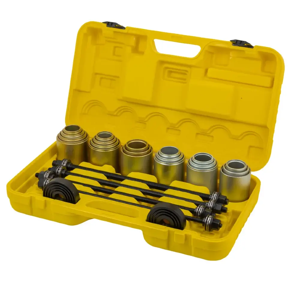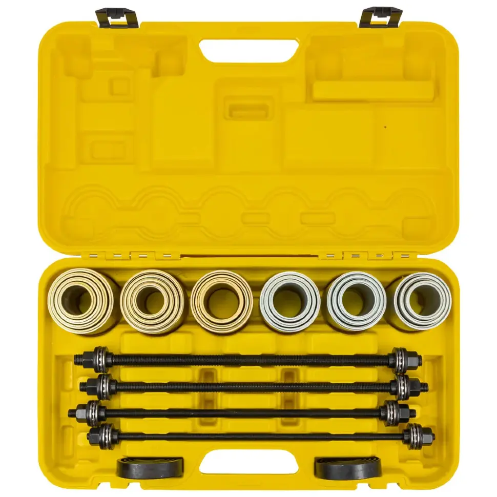 Набор инструментов для замены сайлентблоков, втулок и подшипников WMC TOOLS WMC‑933T1 предназначен для аккуратного демонтажа и монтажа резинометаллических шарниров, втулок и подшипников без необходимости полного снятия узлов подвески. Подходит для обслуживания большинства легковых автомобилей, позволяя выполнять работы прямо на автомобиле, без демонтажа балки или рычага.