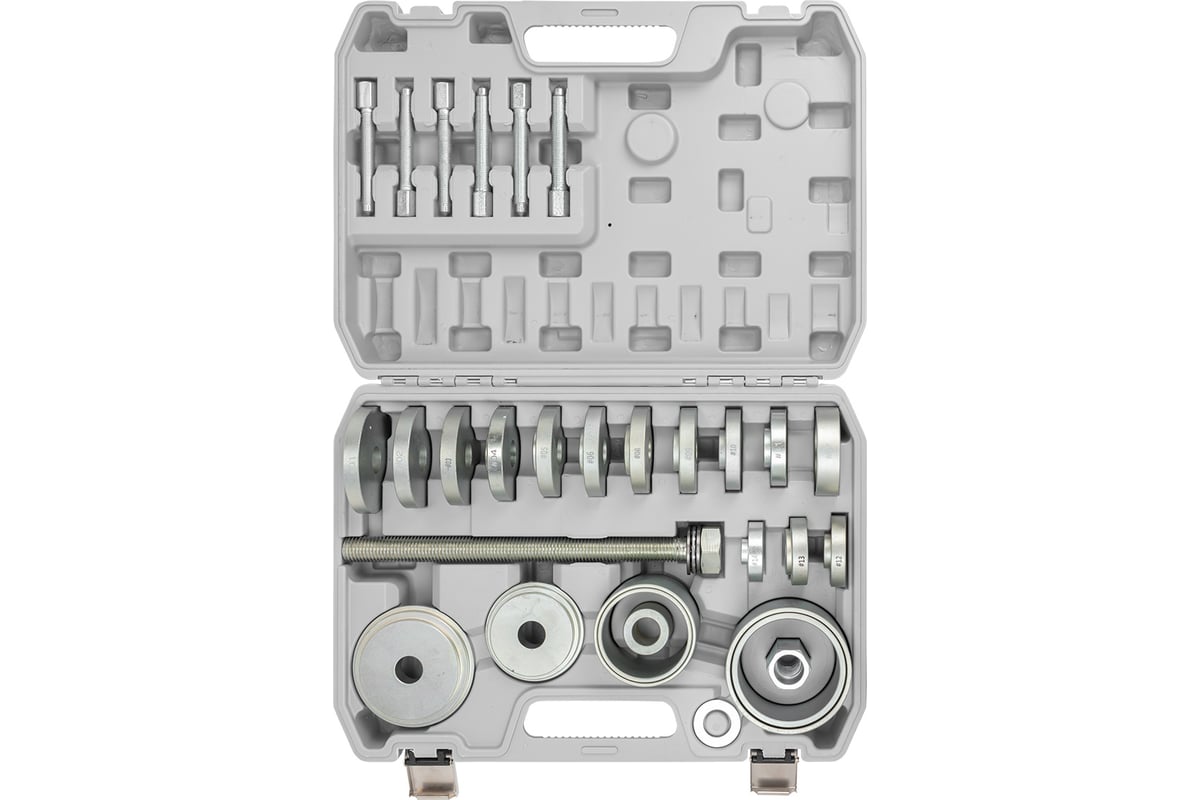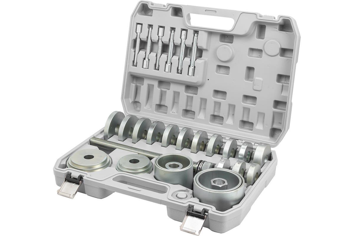 Набор инструментов для замены сайлентблоков, втулок и подшипников SIGMATOOL Sigmatool‑933T4 — комплект из 32 предметов, предназначенный для демонтажа и монтажа резинометаллических шарниров, втулок и подшипников без необходимости полного снятия узлов подвески. Подходит для работы с большинством легковых автомобилей, обеспечивая аккуратное выполнение операций без повреждения деталей и посадочных мест.