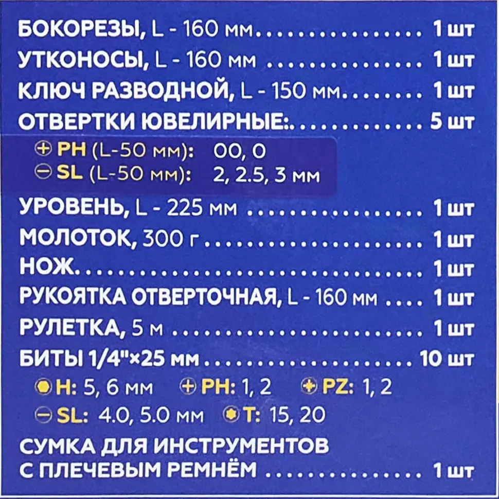 Инструменты изготовлены из прочных материалов, устойчивых к износу, а эргономичные рукоятки обеспечивают комфорт при длительной работе. Комплектация подобрана так, чтобы охватить широкий спектр задач — от работы с крепежом до измерений и разметки.