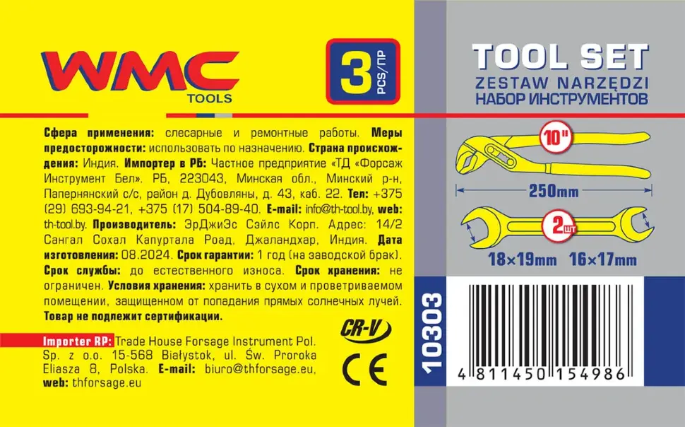 Набор ключей 3пр.(16х17,18х19мм+пассатижи переставные-250мм) WMC TOOLS WMC-10303