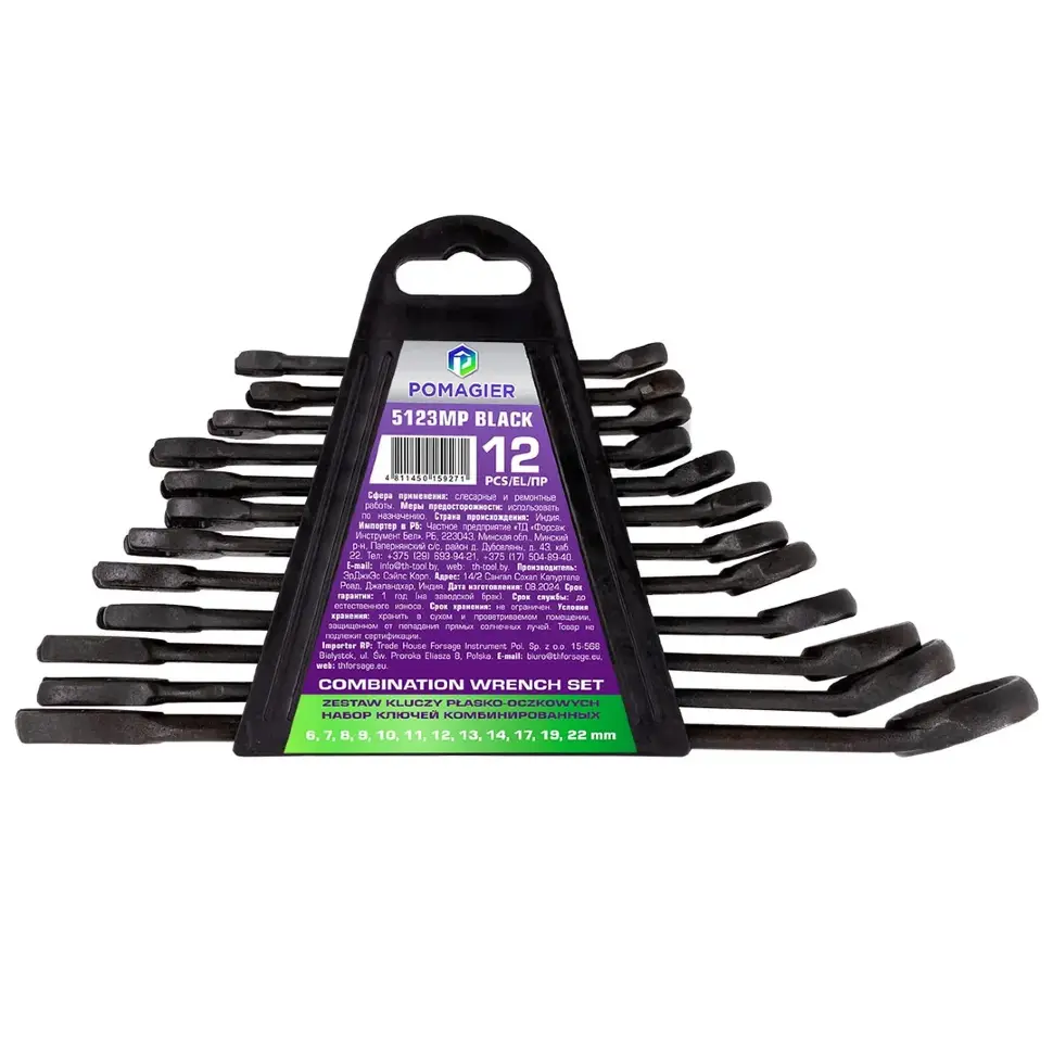 Набор комбинированных ключей POMAGIER POM‑5123MP BLACK — 12 предметов — универсальный комплект для слесарных, монтажных и бытовых работ. Каждый ключ сочетает рожковую и накидную части, что делает набор особенно удобным при работе с крепежом в труднодоступных местах.
