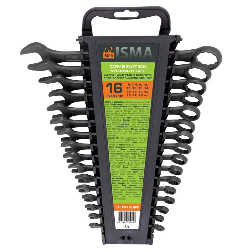 Набор ключей комбинированных 16 пр (6-19,22,24мм), в пластиковом держателе ISMA ISMA-5161MP BLACK